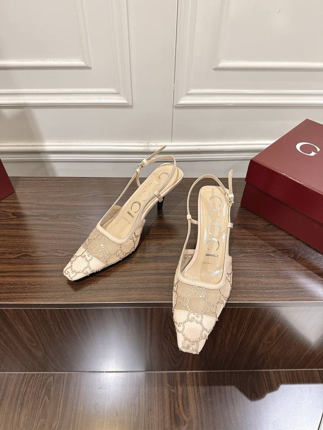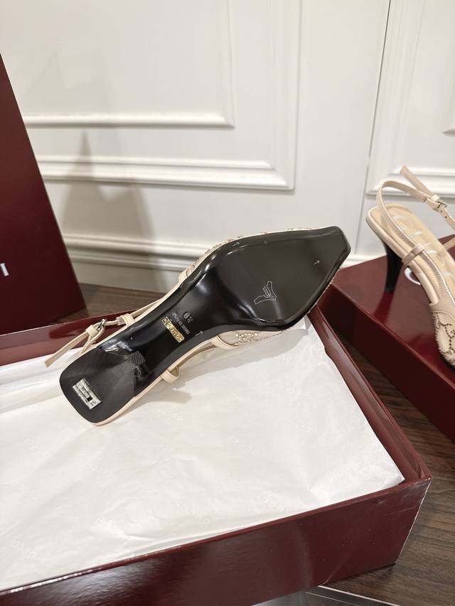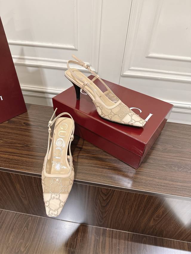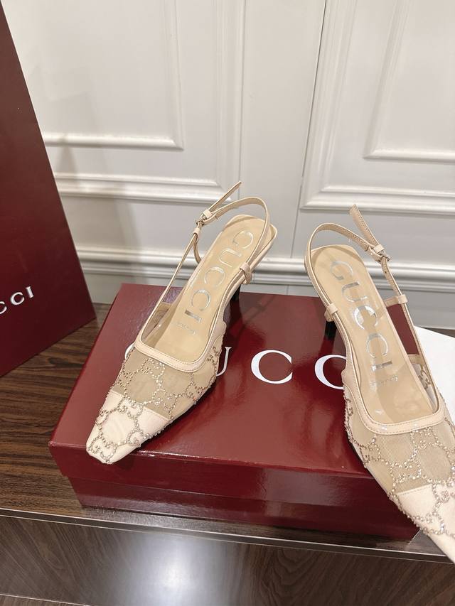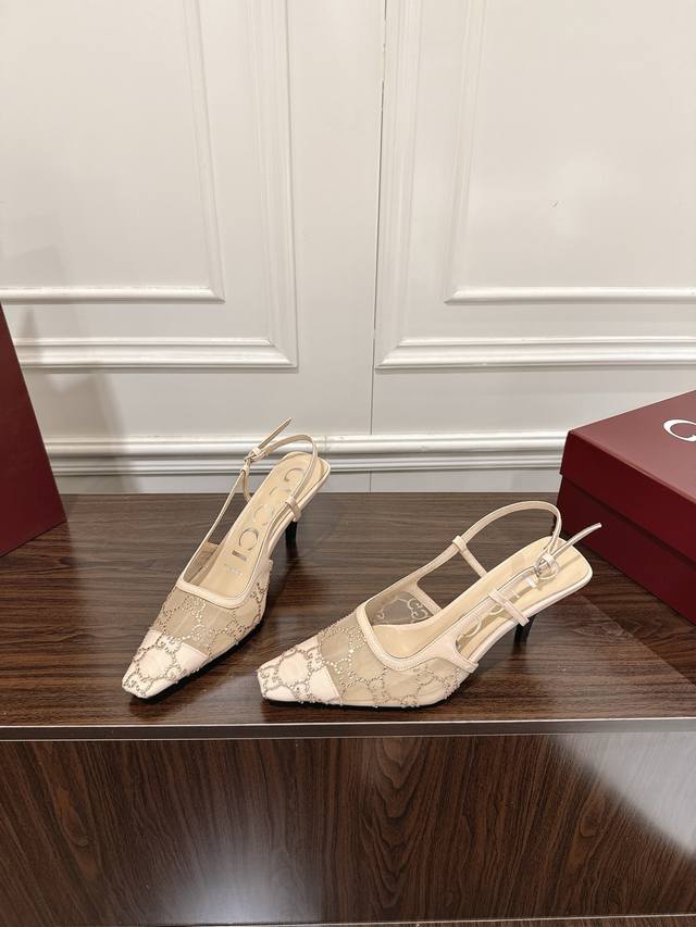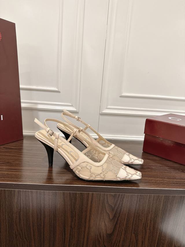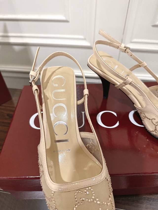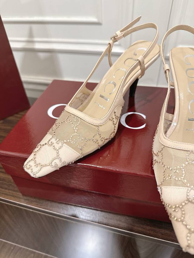 古驰 Aria-时尚咏叹调 系列撷取 年代和2000年代初品牌典藏设计的灵感元素,糅合Tom Ford执掌Gucci时期的造型风格,打造一系列令人惊艳的作品。蕾丝、水晶和薄纱等富有女性魅力的细节展现女性气质的新理念。这款后系带鞋由饰有闪亮 Gg图案的黑色网眼布焕新演绎。