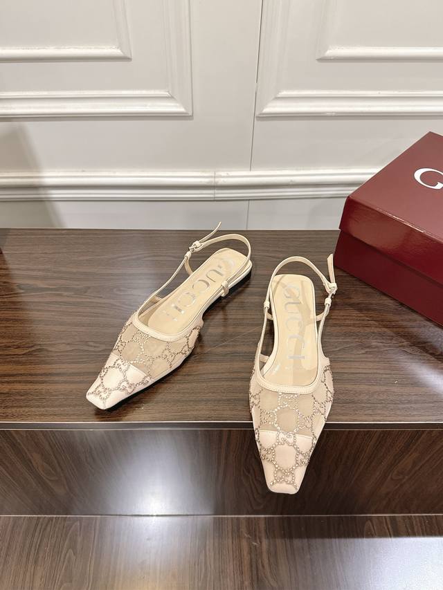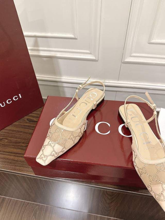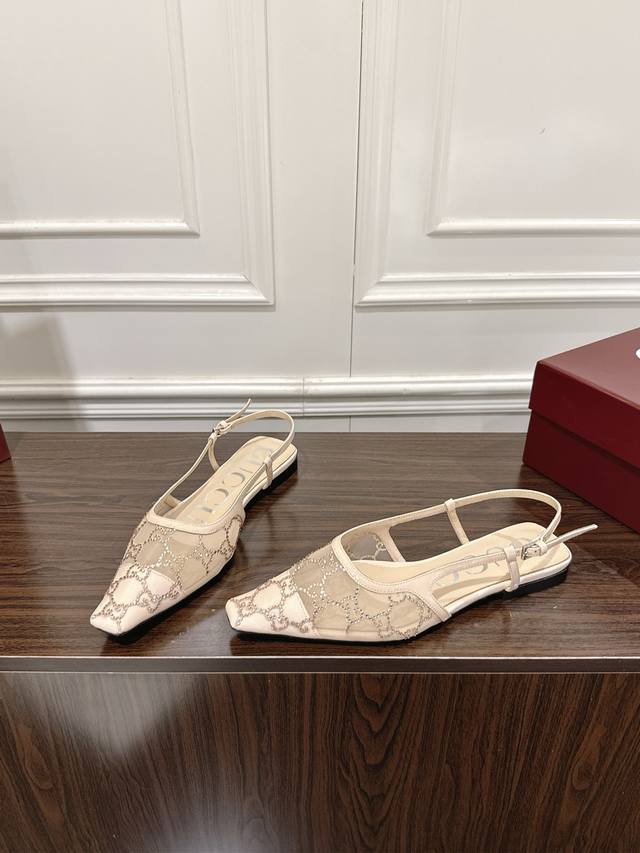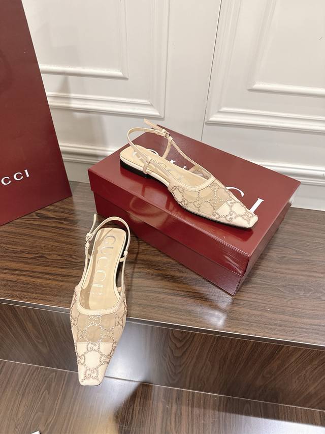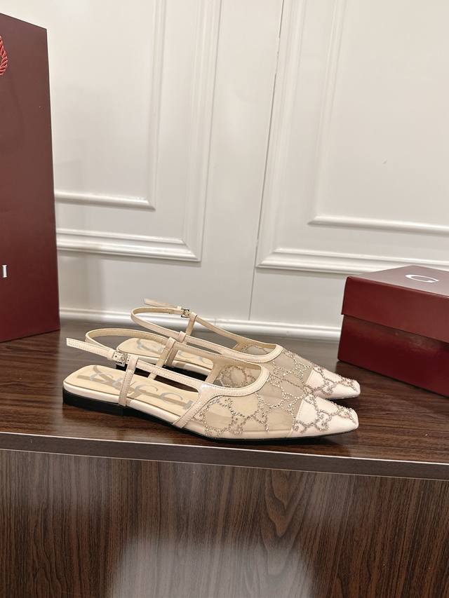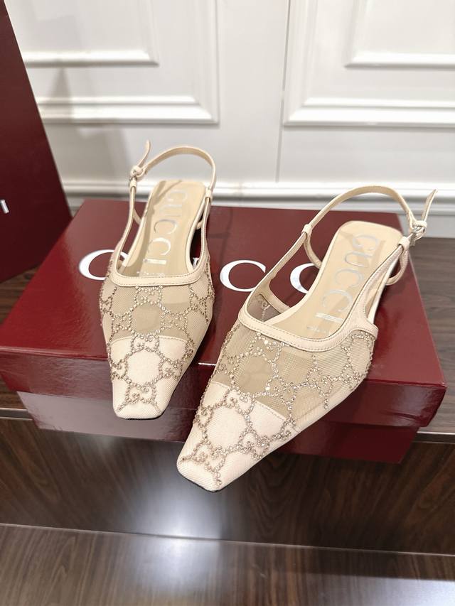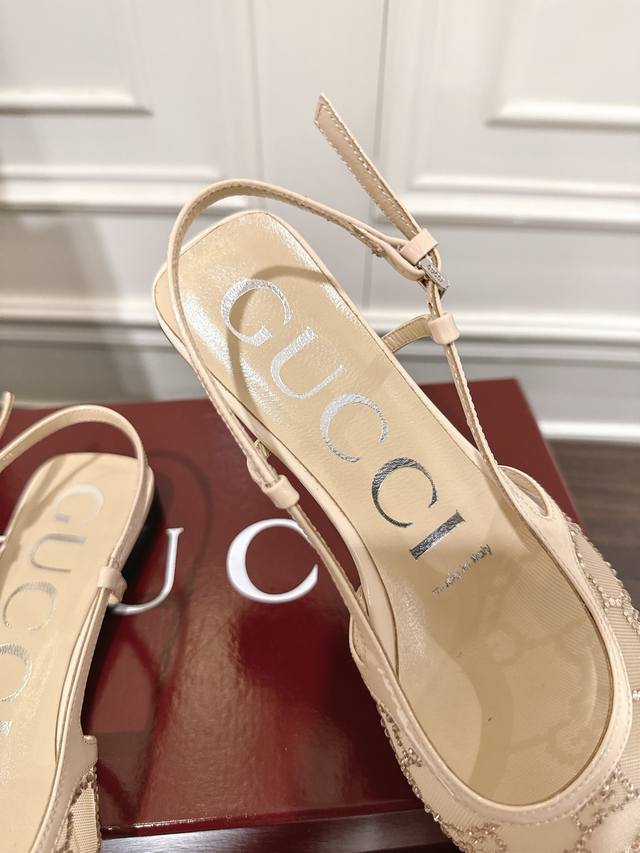 古驰 Aria-时尚咏叹调 系列撷取 年代和2000年代初品牌典藏设计的灵感元素,糅合Tom Ford执掌Gucci时期的造型风格,打造一系列令人惊艳的作品。蕾丝、水晶和薄纱等富有女性魅力的细节展现女性气质的新理念。这款后系带鞋由饰有闪亮 Gg图案的黑色网眼布焕新演绎。