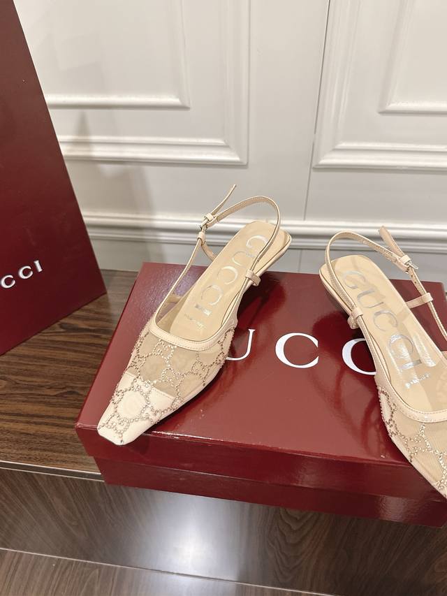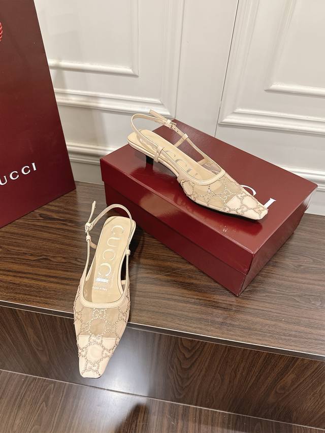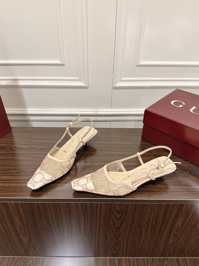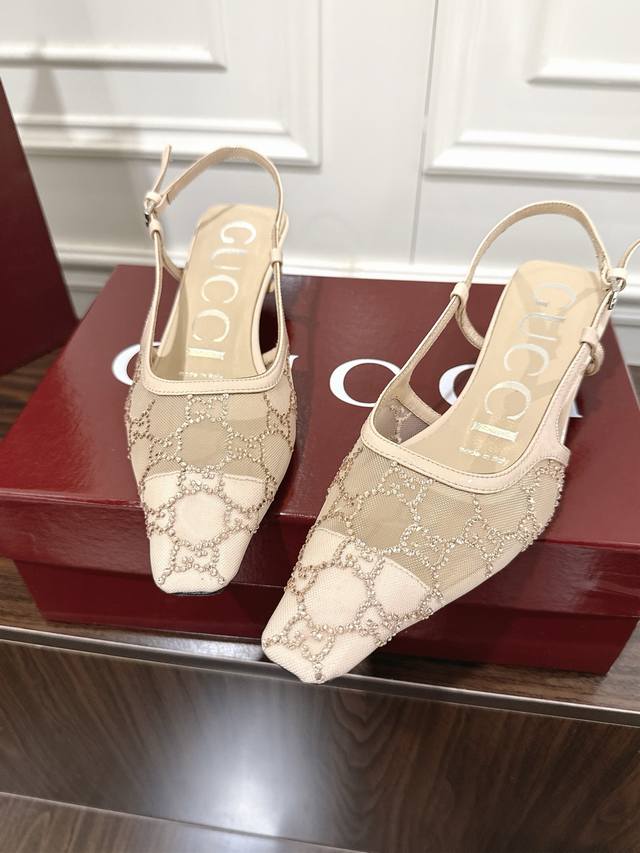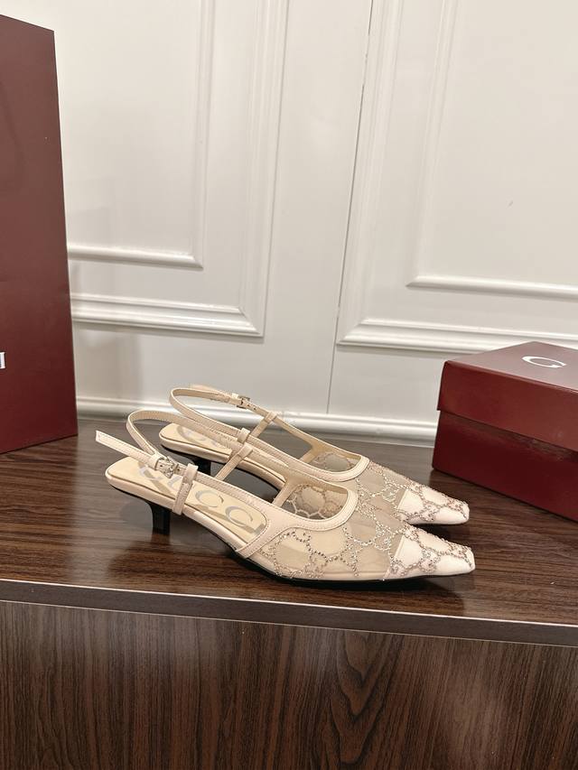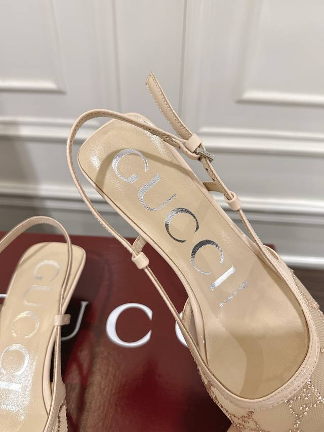 古驰 Aria-时尚咏叹调 系列撷取 年代和2000年代初品牌典藏设计的灵感元素,糅合Tom Ford执掌Gucci时期的造型风格,打造一系列令人惊艳的作品。蕾丝、水晶和薄纱等富有女性魅力的细节展现女性气质的新理念。这款后系带鞋由饰有闪亮 Gg图案的黑色网眼布焕新演绎。