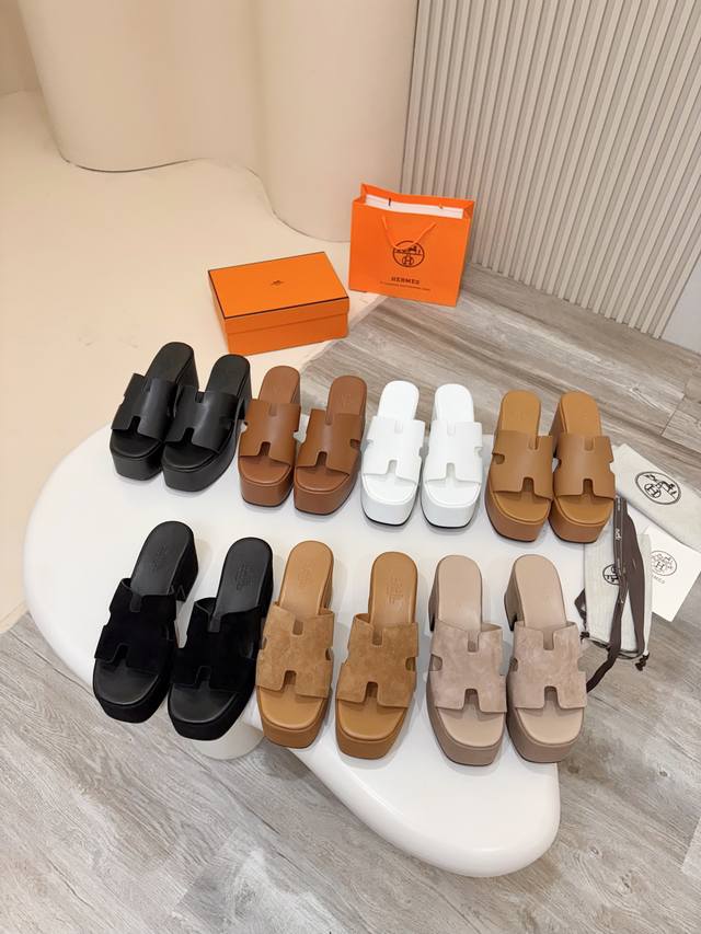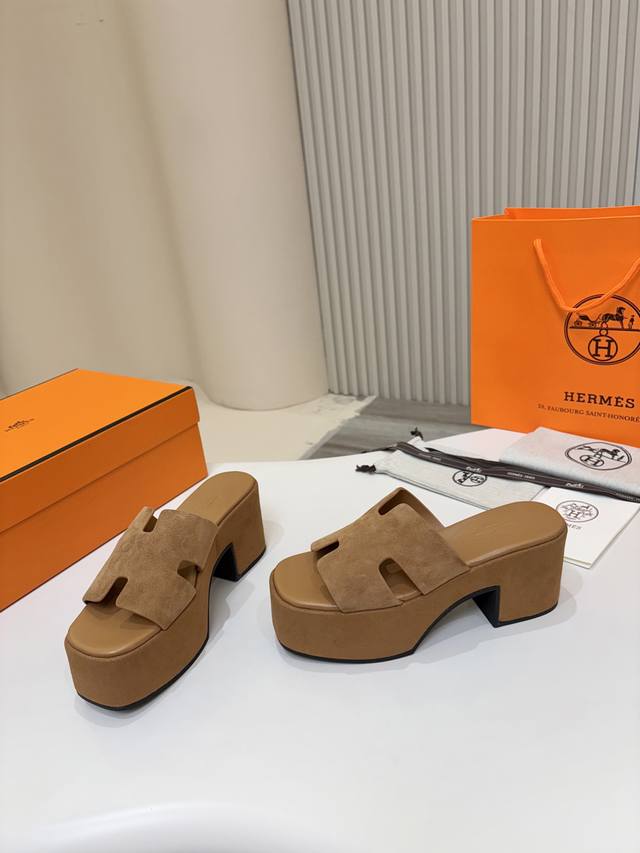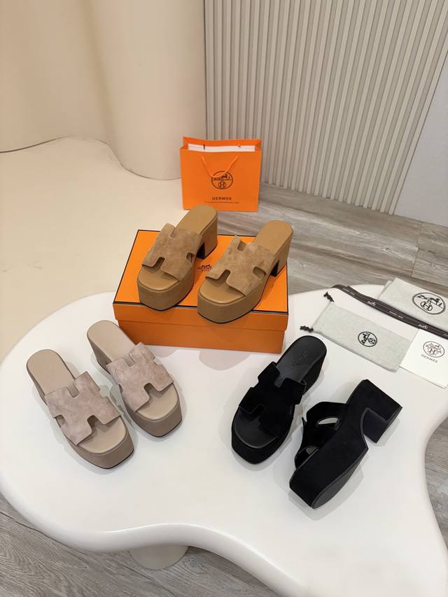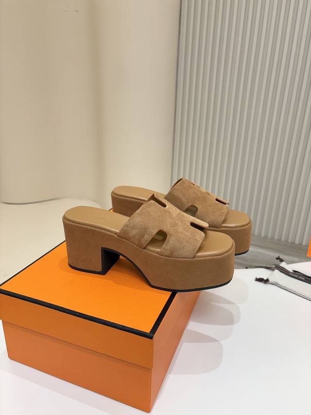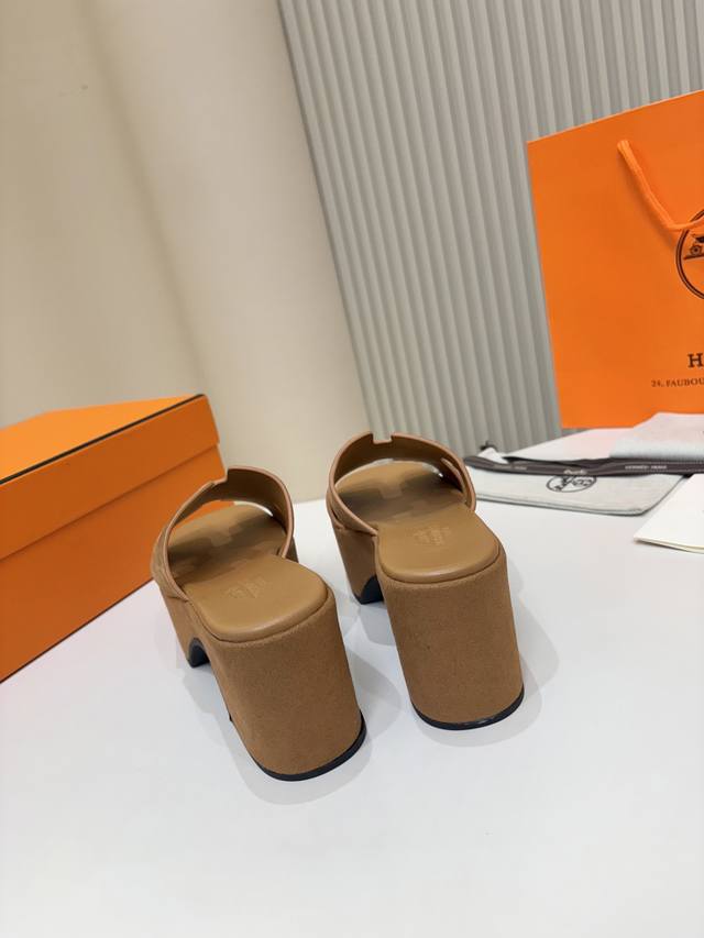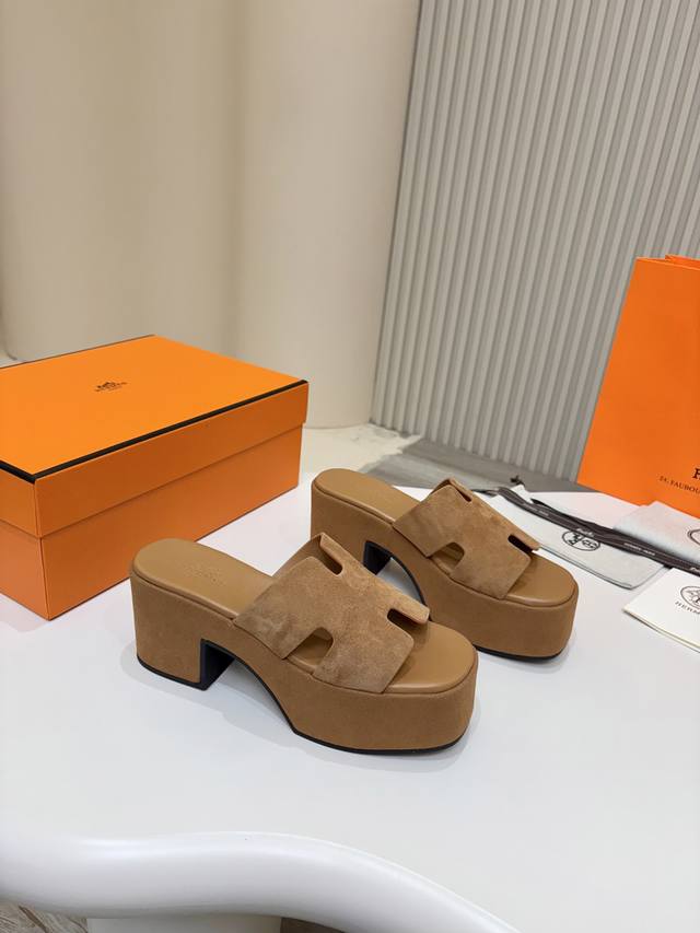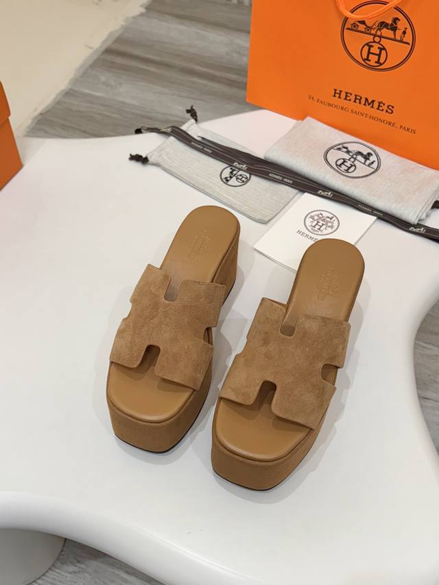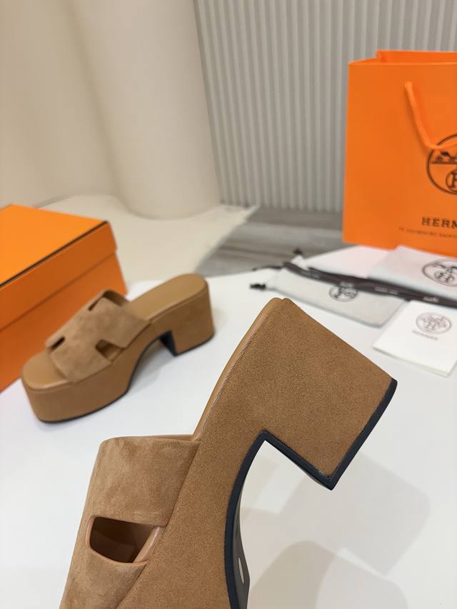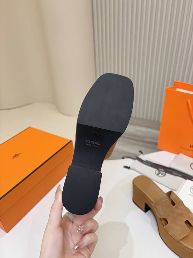 ** 经典中的经典!** 爱马仕这款工字高跟拖鞋,厚底坡跟设计,**后跟7.5Cm黄金高度**,前面4.5Cm水台,**显高不累脚**,小个子女生也能轻松驾驭!