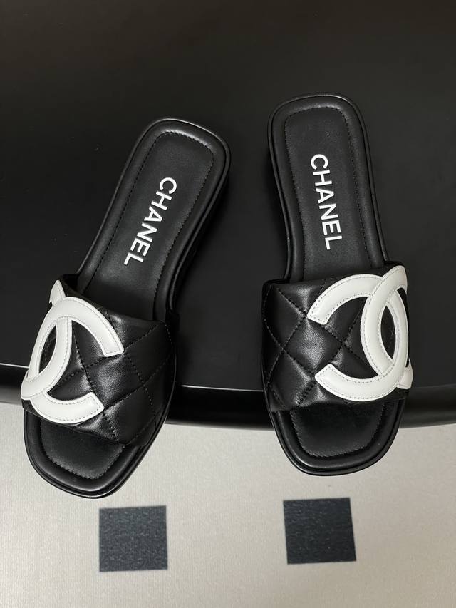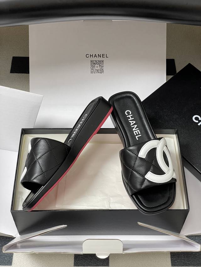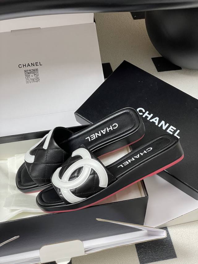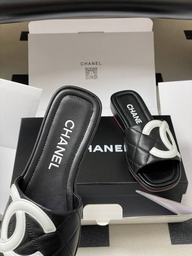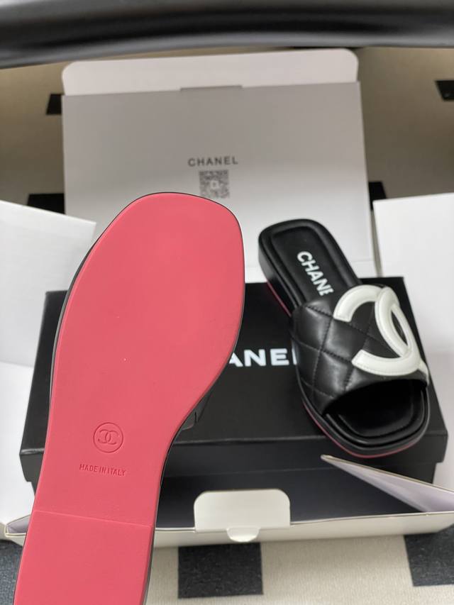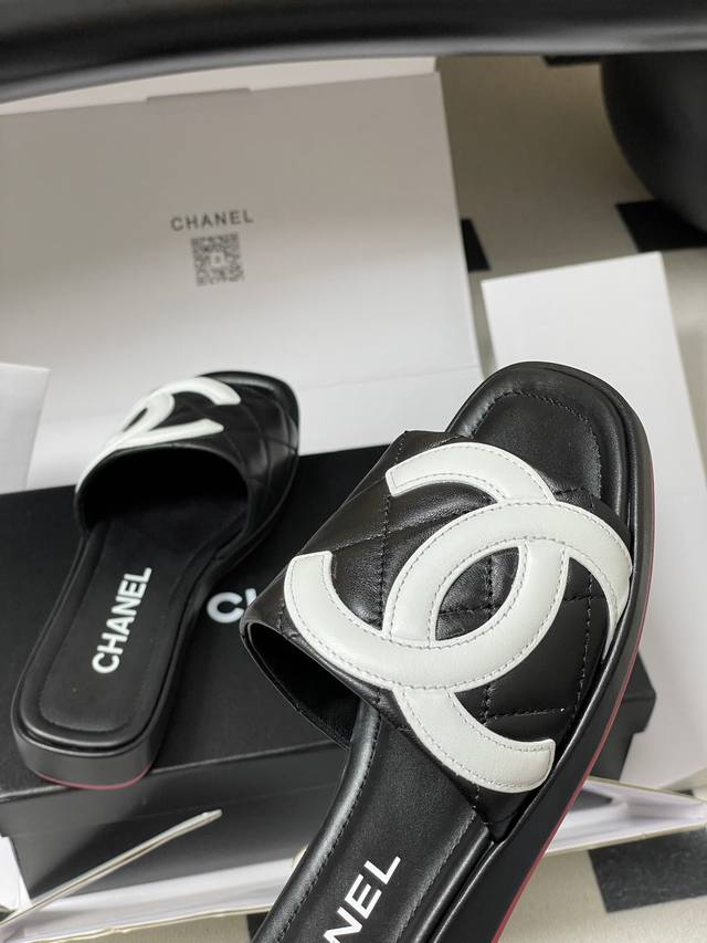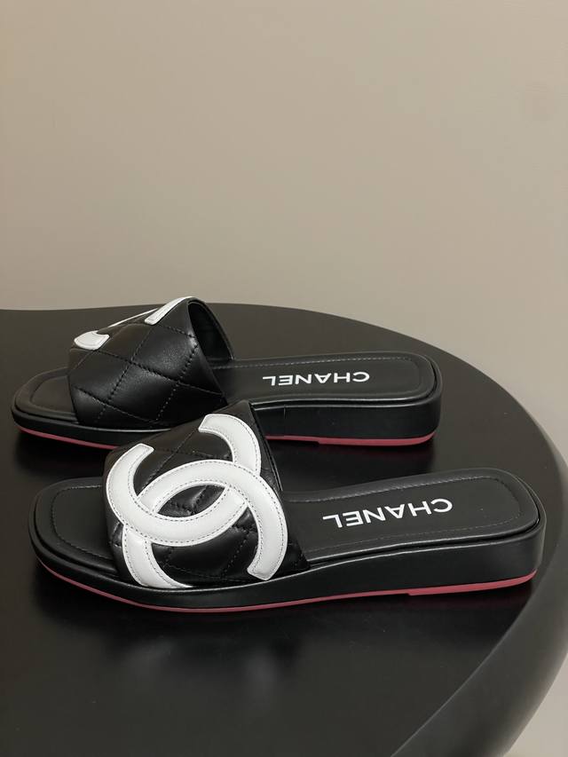 Chanel 小香中古康鹏熊猫配色一字带拖鞋复古大双C菱格厚底凉拖鞋