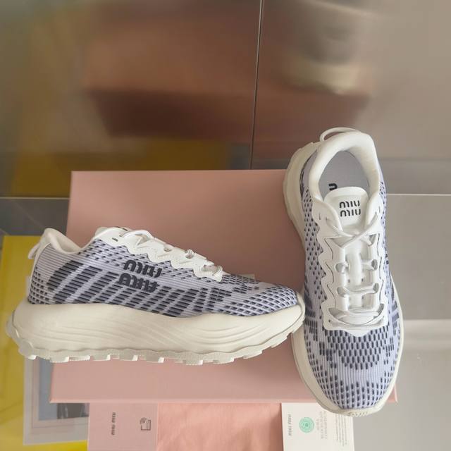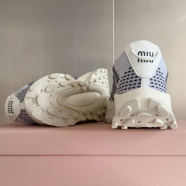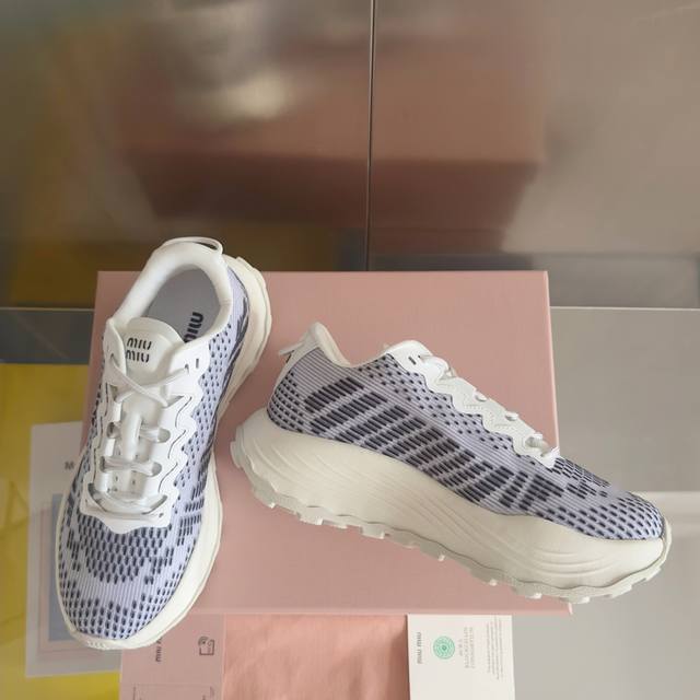原版购入开发 做货 这款充满个性的大胆技术面料运动鞋因其线条和动态鞋底而脱颖而出,体现了Miu Miu的运动精髓