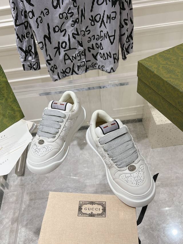 / 顶级版本 Gucci最新款胖嘟嘟厚底脏脏鞋~~情侣款休闲鞋,6Cm增高鞋~~ 鞋面擦色牛皮拼接经典双G皮面料,皮里细腻吸汗透气,垫脚乳胶注塑一体,私模6Cm厚T