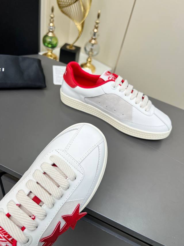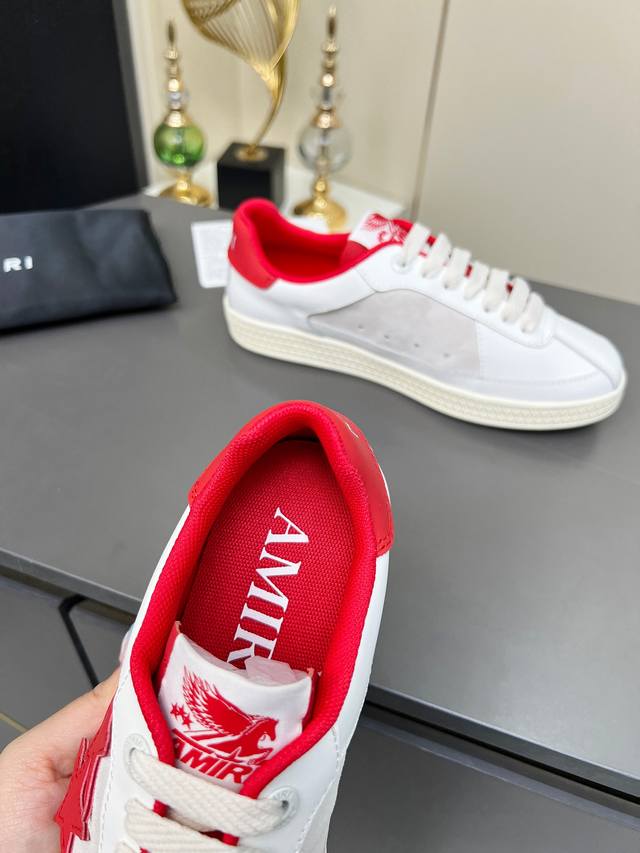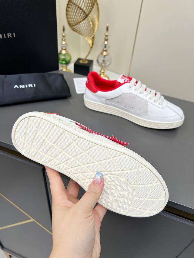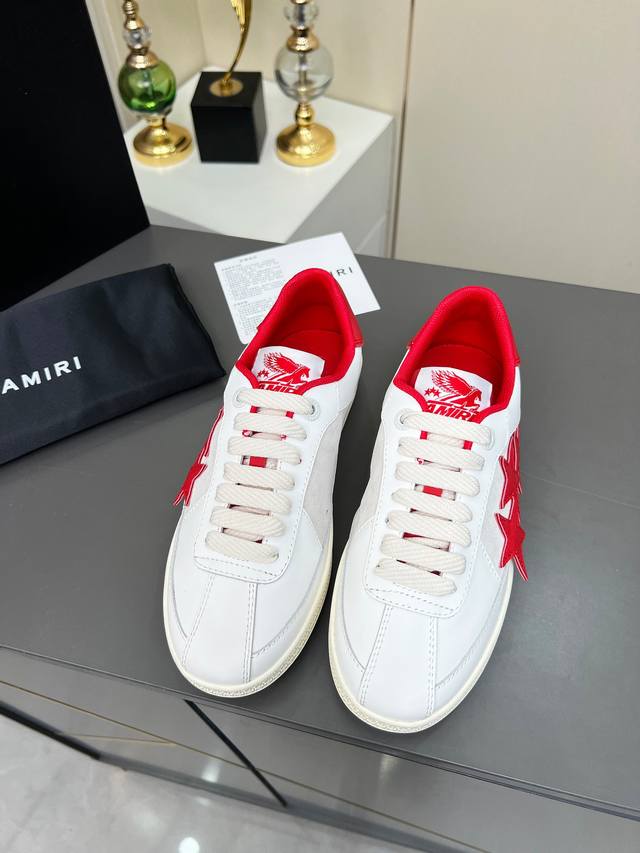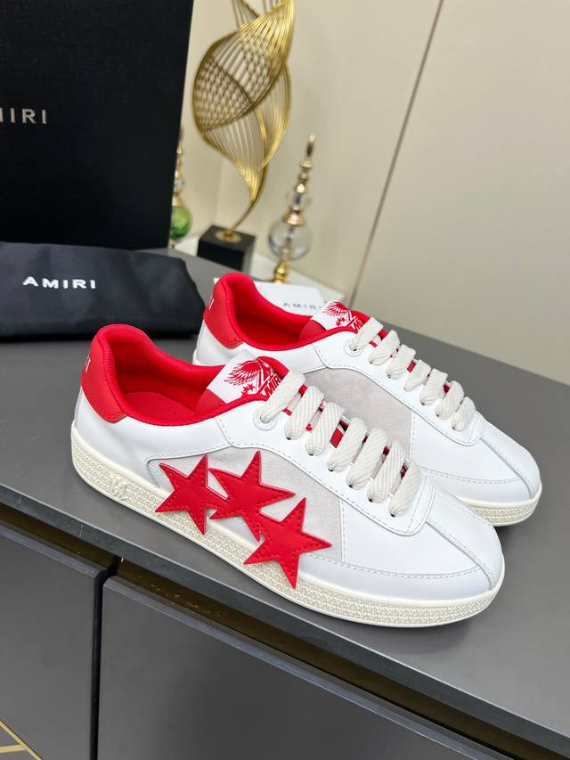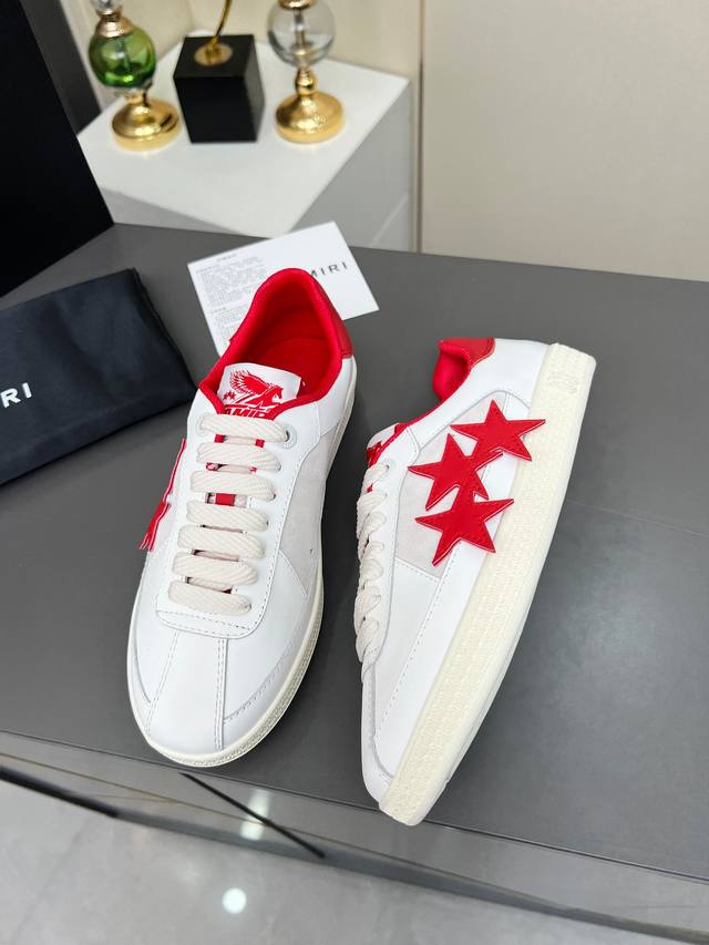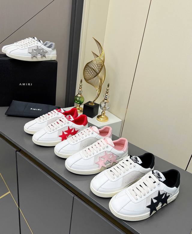 “Thepacific” 撞色五角星系列植根于 Amiri 独特的加州基因,展现西海岸的自由与闲适氛围。此系列推出两款风格,融入了品牌标志性元素:皮革款以纯白皮革搭配同色鞋底,鞋侧点缀星星图案,宛如加州璀璨星空。黑色与海洋蓝配色为男女款共享配色,另有男士专属的红色星星款与女士专属的浅粉星星款;而麂皮款则以品牌经