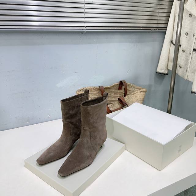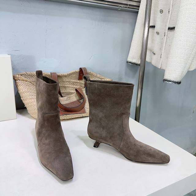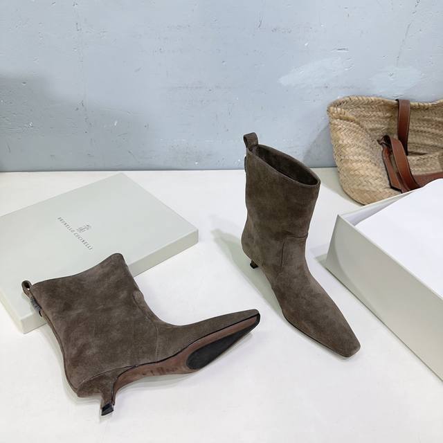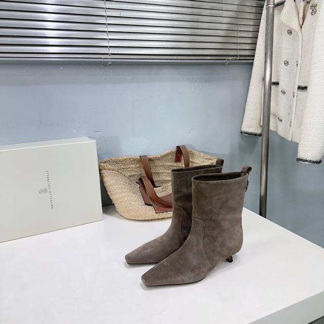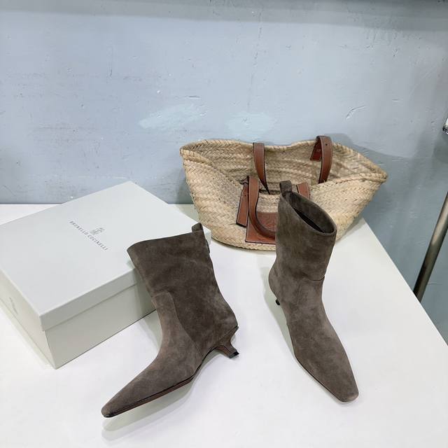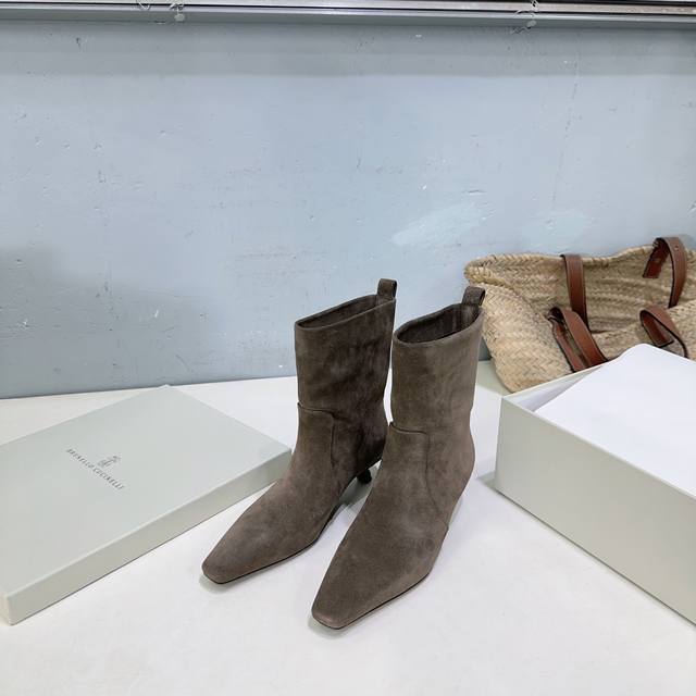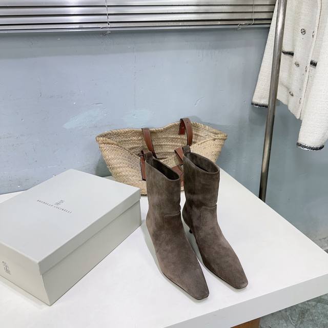 高品质出厂皮面 !绒面470!顶级品质!Brunello Cucinelli Bc 2025Ss秋冬简易小方头猫跟直筒短靴、秋冬系列新品!