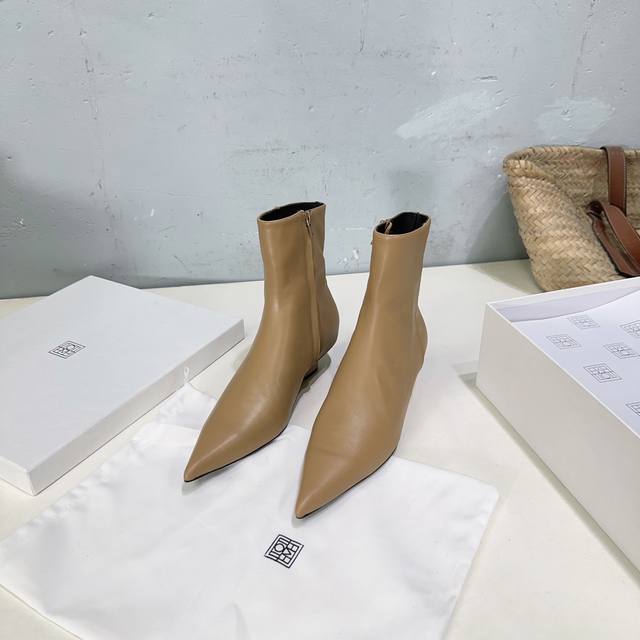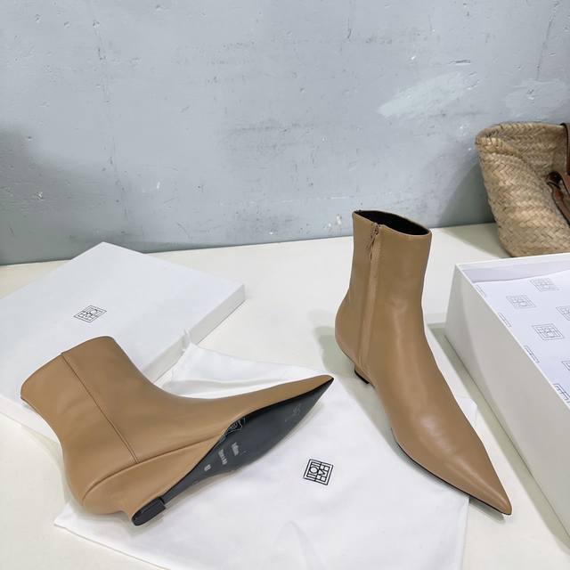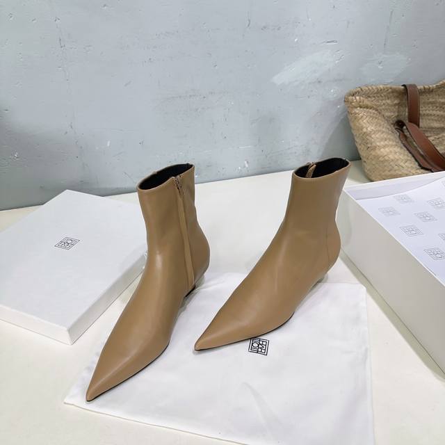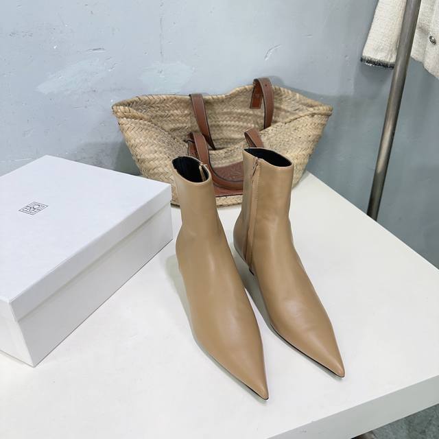 高品质出厂 !小众潮牌Toteme25Ss早秋新款复古坡跟短靴尖头侧拉链短靴!绝美裸靴!时髦极小尖头搭配坡跟内增高的设计 潇洒百搭而且脚感很稳。鞋型纤细又时髦,微微的堆积感超显腿细 女神的百搭瘦腿靴,轻松穿出时尚大长腿!