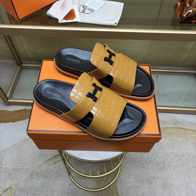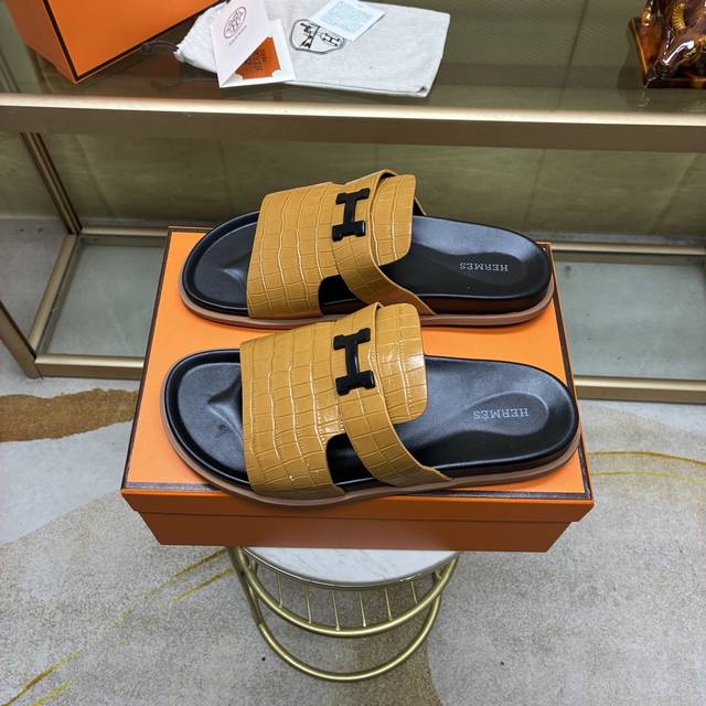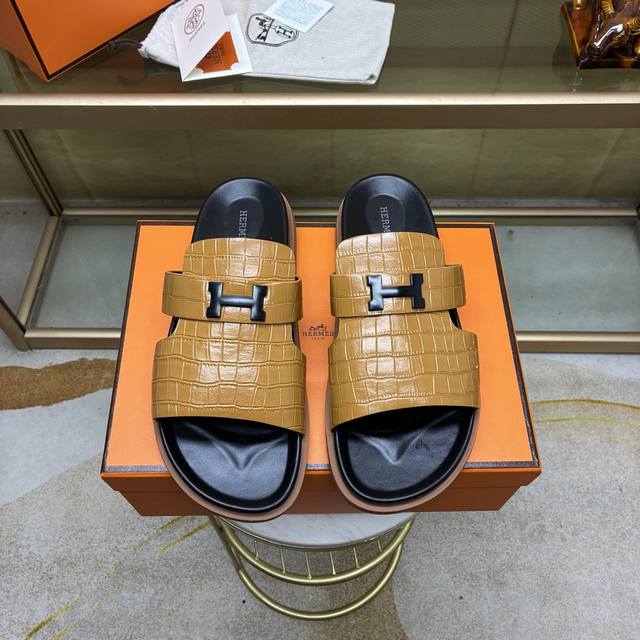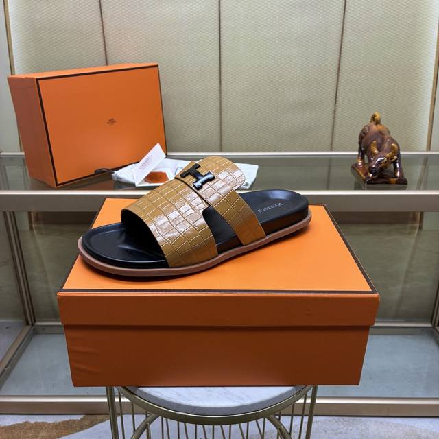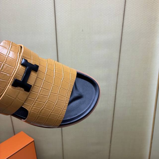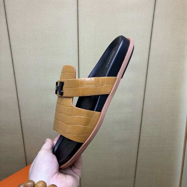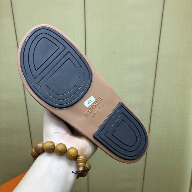/ 高端版本。 Hermes 爱马仕 男士拖鞋休闲款,专柜对比质量 鞋面头层石头纹,纹路清晰,彰显高端,上档次,穿着舒适,百搭。纯手工拉线,生胶透气防滑大底,内里透
