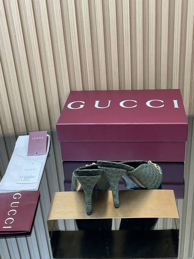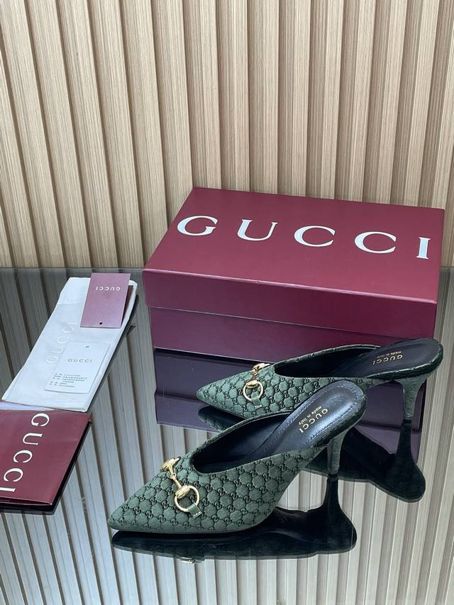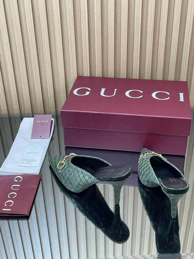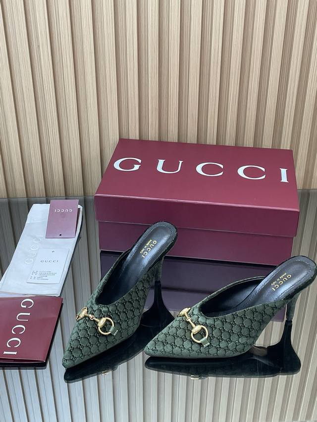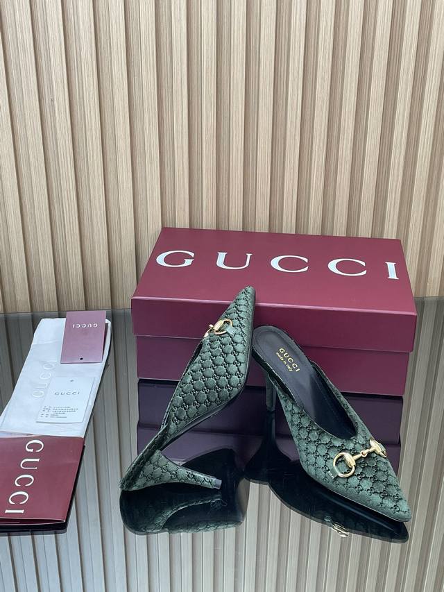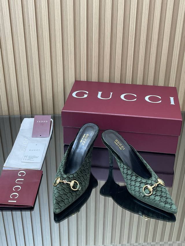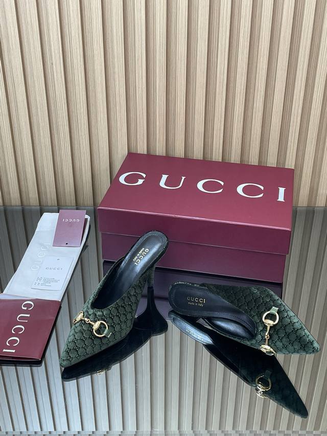 2025早秋G家新款Gucc马衔扣露跟浅口细跟高跟尖头凉鞋进口丝滑G G金丝天鹅绒慕勒拖鞋凉鞋 出厂价P