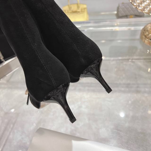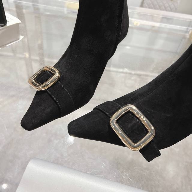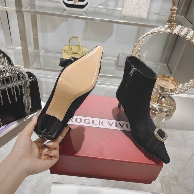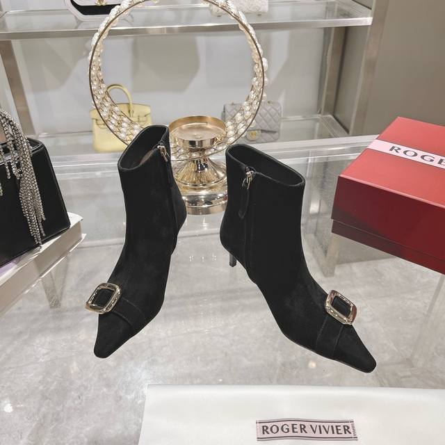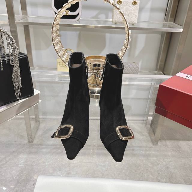 25新款Rv女鞋Viv Choc金属扣细跟高跟短靴 Rv新出的靴子太惊艳了,Viv靴点缀品牌标志性饰扣尽显当代时尚理念,柔软的绒面皮革手工制成,镀漆后跟纤细,呈