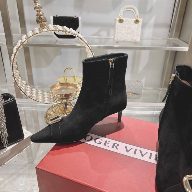 25新款Rv女鞋Viv Choc金属扣细跟高跟短靴 Rv新出的靴子太惊艳了,Viv靴点缀品牌标志性饰扣尽显当代时尚理念,柔软的绒面皮革手工制成,镀漆后跟纤细,呈现曼妙身姿 上脚不要太好看脚踝靴是真的性感 把脚踝的线条展露无遗 超显脚细 穿上去就心动了 跟闺蜜一人一双超好看