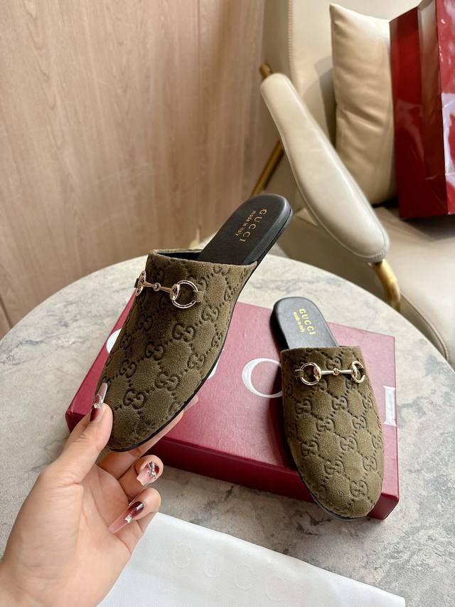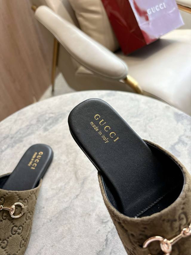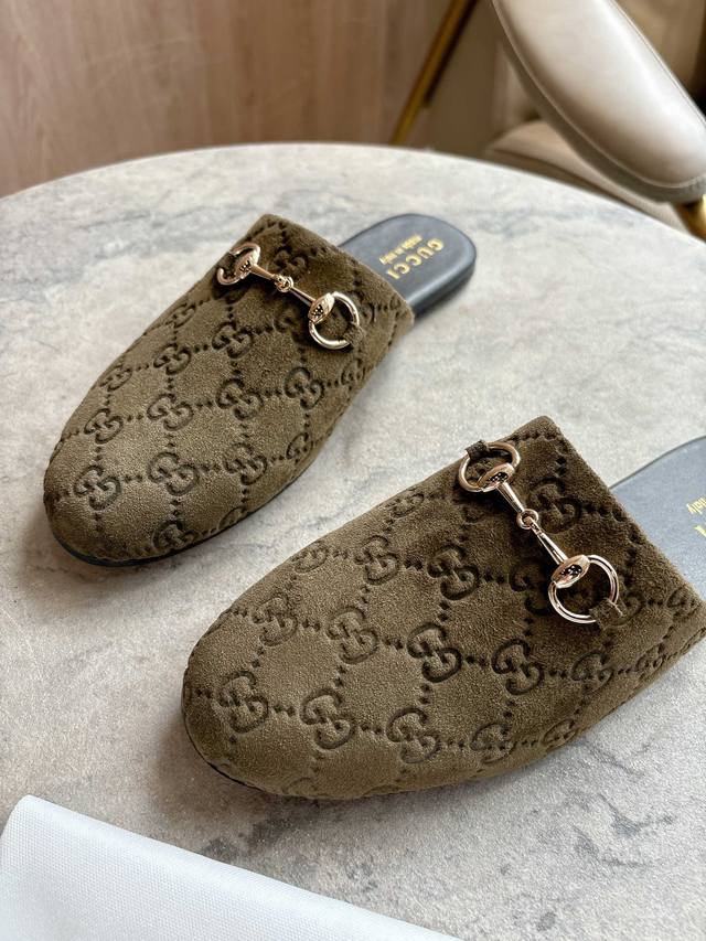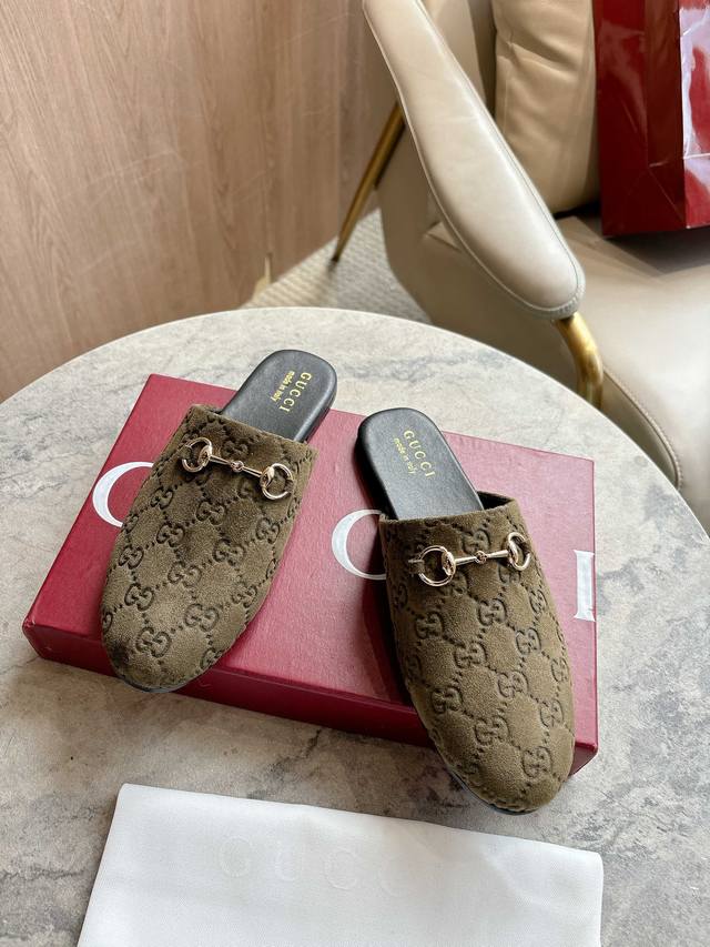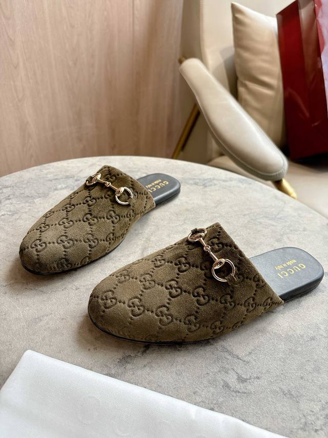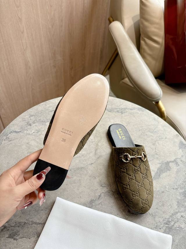 3669-10 绿G 35-42 2025秋冬系列, 典藏图案继续在Gucci全新系列中大放异彩。全新系列匠心呈献马衔扣配件,彰显品牌马术传承。这款男士穆勒鞋采用光滑绒面材质匠心打造,搭配浅金色调配件增添亮眼细节。