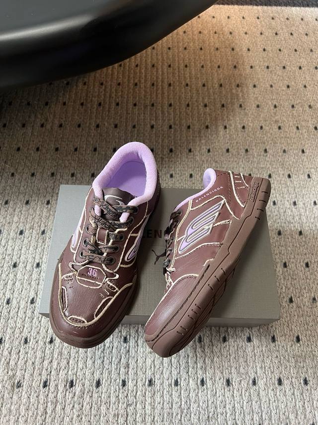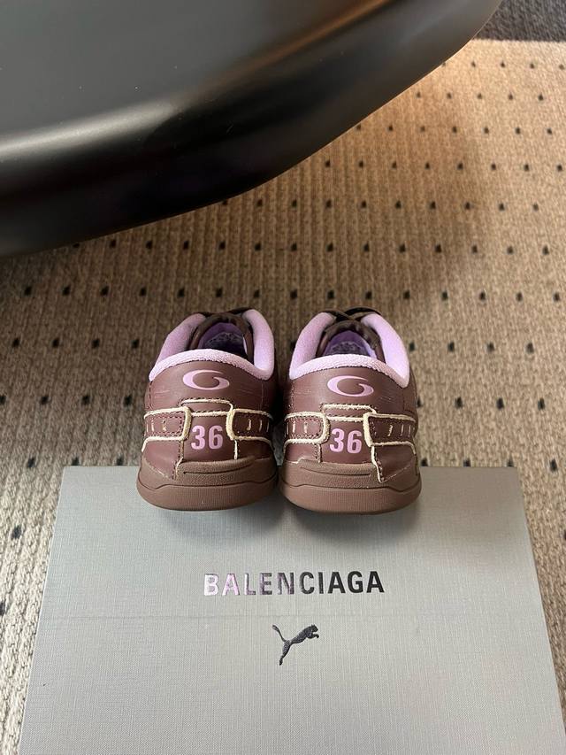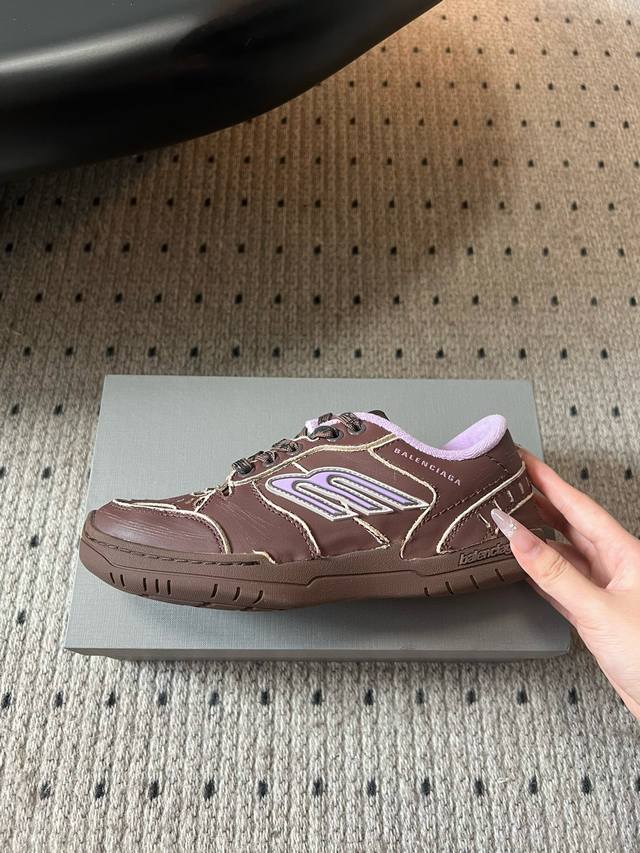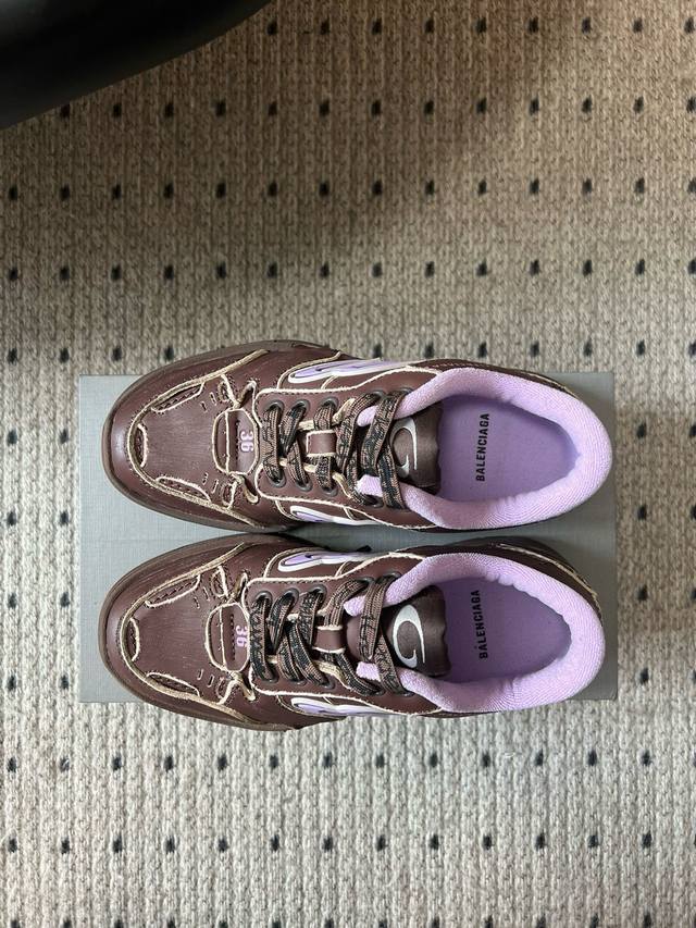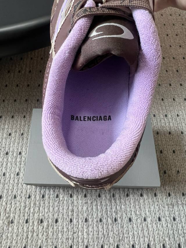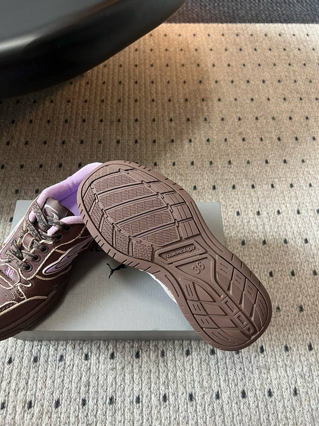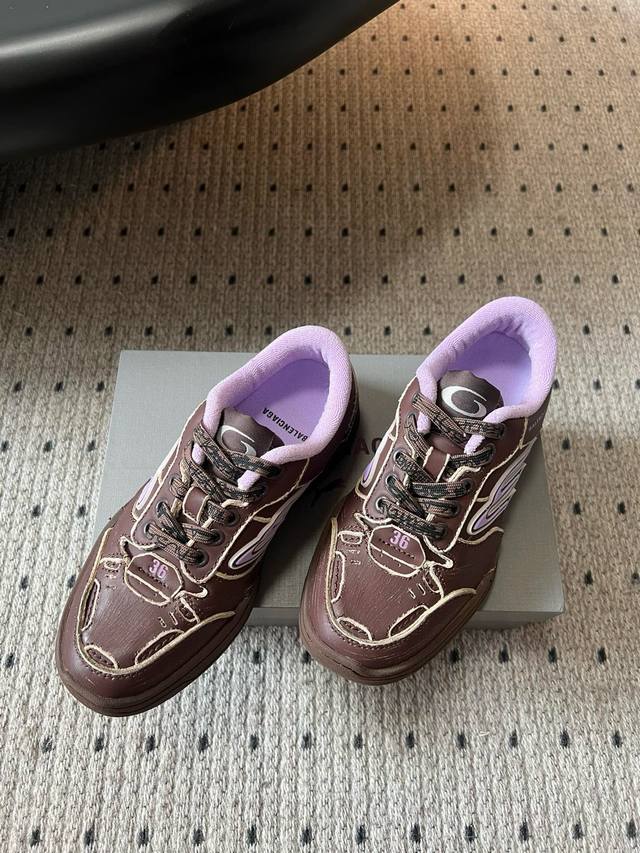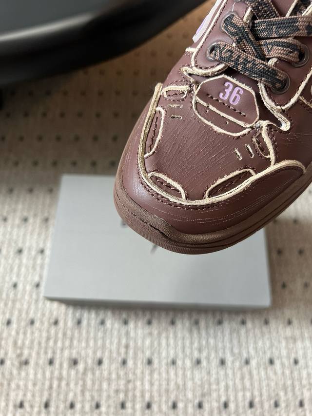 原版购入开发 做货 巴黎世家这款全鞋都订满了订书钉,这双鞋特点可以用三个关键词概括:复古,阔型,运动鞋。极具识别度的线条以及独特的鞋形设计,搭配上强烈的旧日效果,从而创造一个充满表现力的设计风格