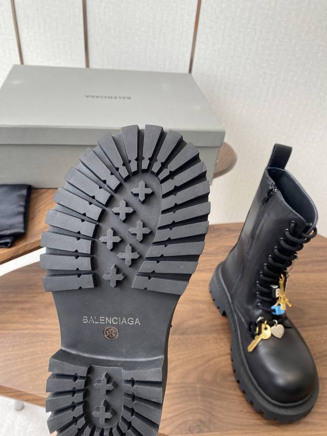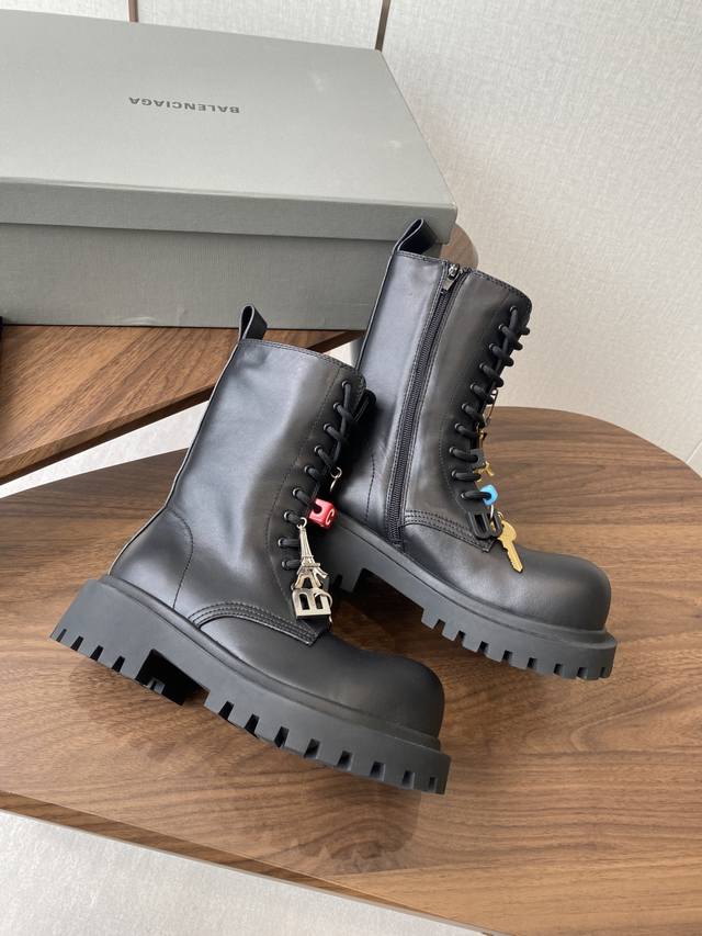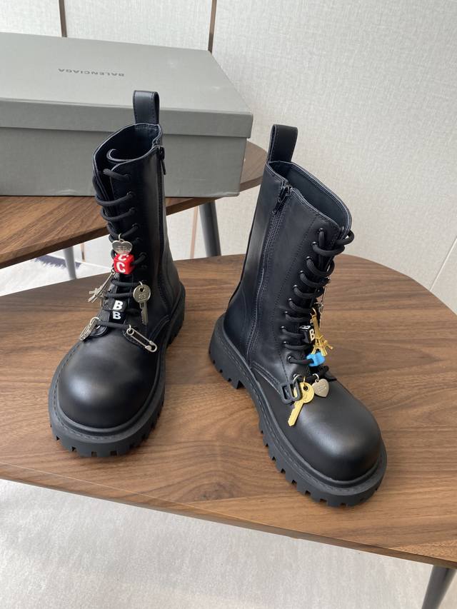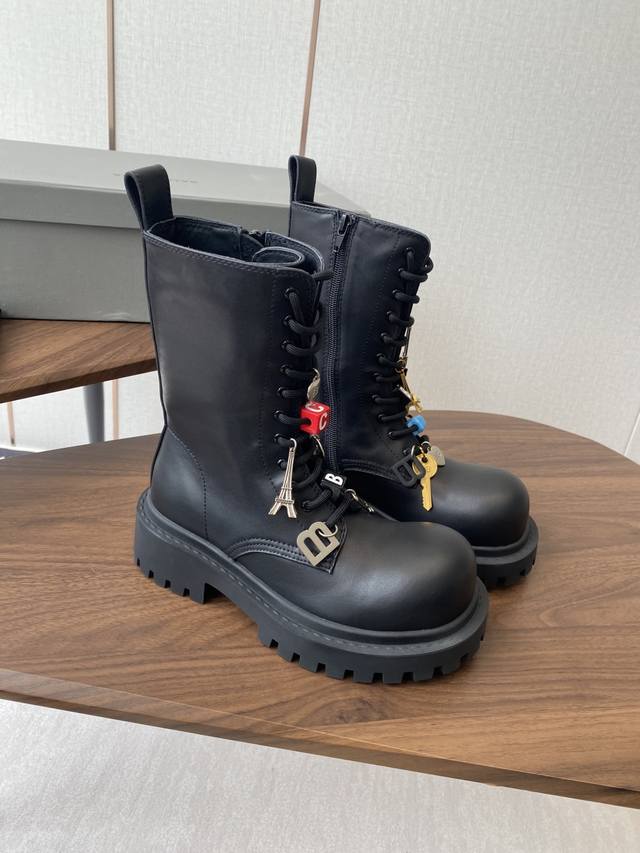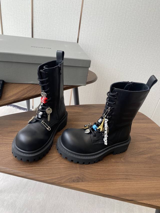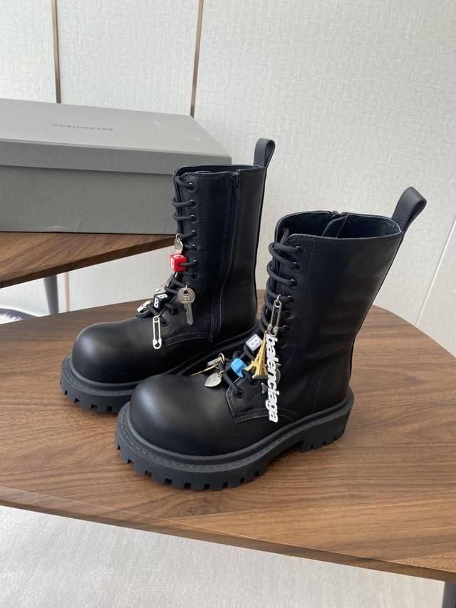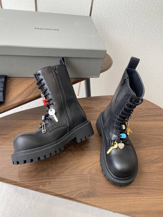 以其独特的魅力脱颖而出,靴子上那典型的硬件效果不仅彰显了岁月的痕迹,更赋予了其一种别样的韵味。而精心点缀的各式钥匙、挂饰以及小徽章等饰品,无疑为这双靴子增添了无尽的魅力细节,使其视觉效果层次丰富
