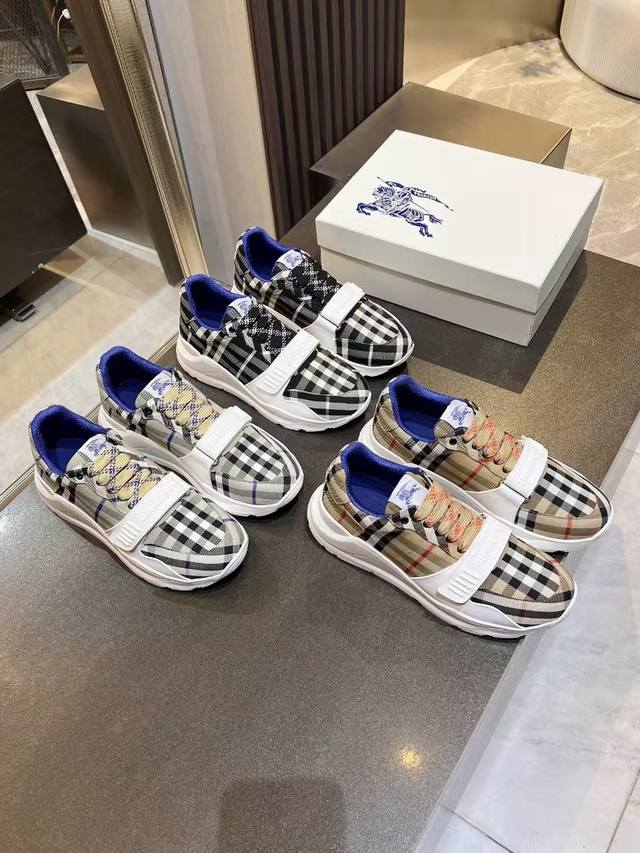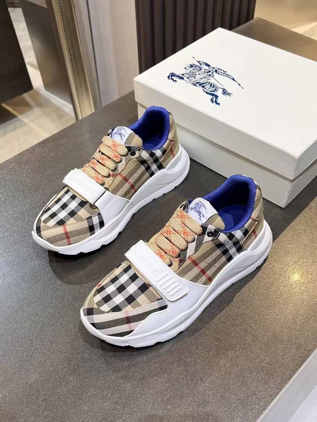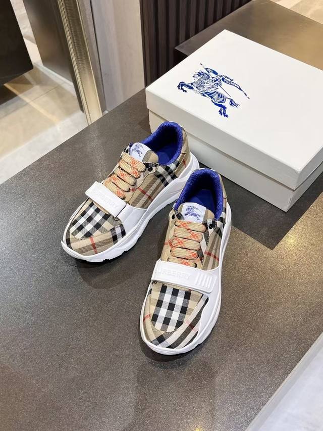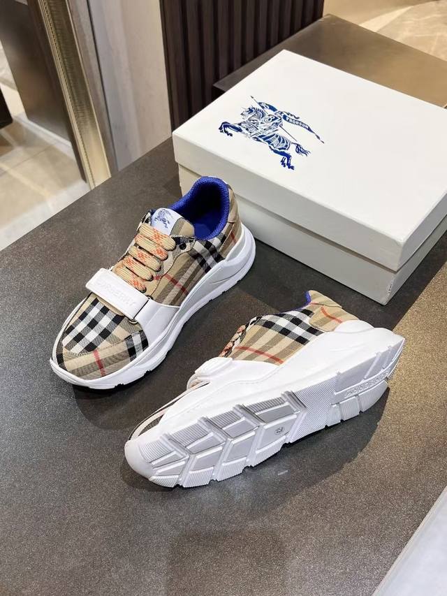 / Burberry意大利制造的弹力尼龙运动鞋,饰有格子图案。网眼衬里款式的鞋带采用带刺拼接线,橡胶鞋底印有博柏利档案刻字。 系带闭合 圆形鞋头 带刺铁丝配件 鞋底