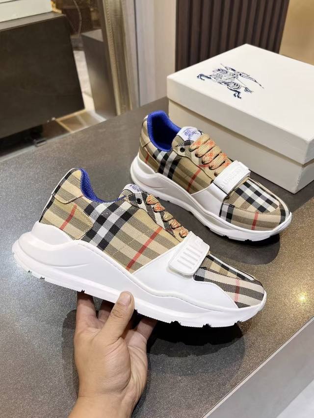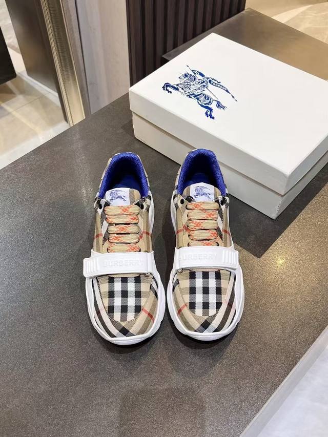 Burberry意大利制造的弹力尼龙运动鞋,饰有格子图案。网眼衬里款式的鞋带采用带刺拼接线,橡胶鞋底印有博柏利档案刻字。 系带闭合 圆形鞋头 带刺铁丝配件 鞋底印有博柏利字样,码数女35-40,男39-46