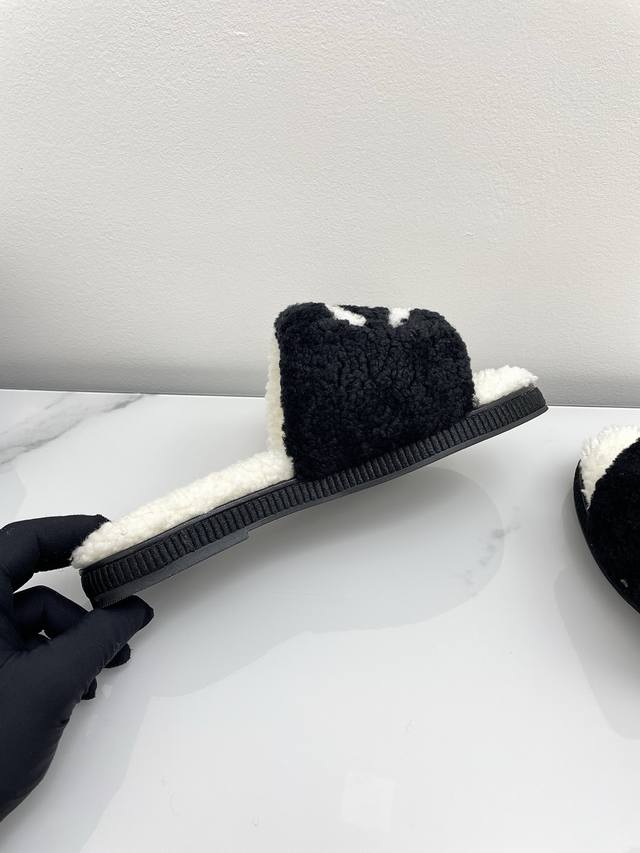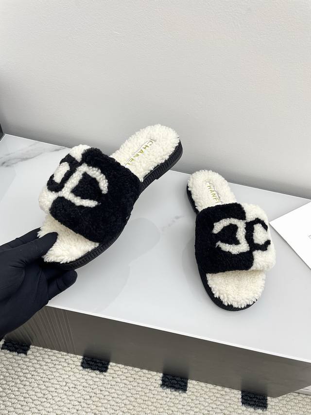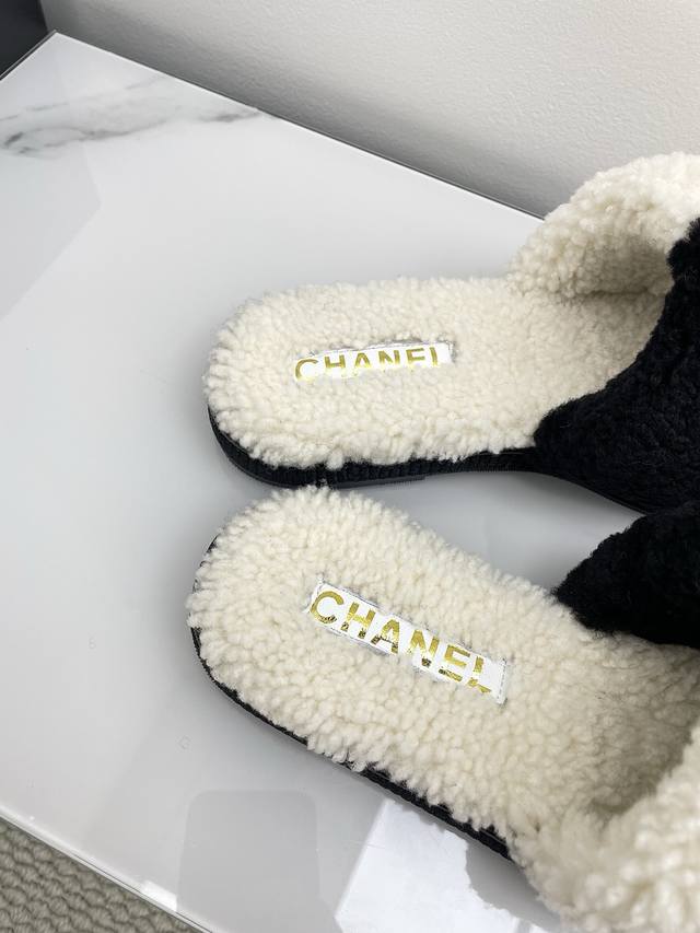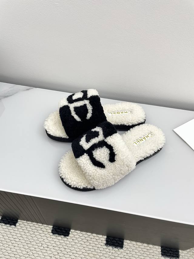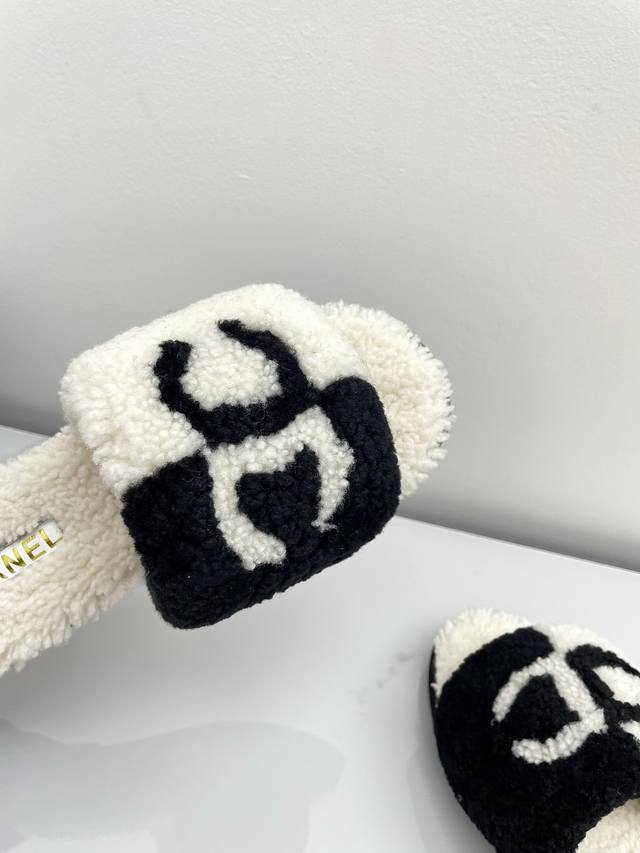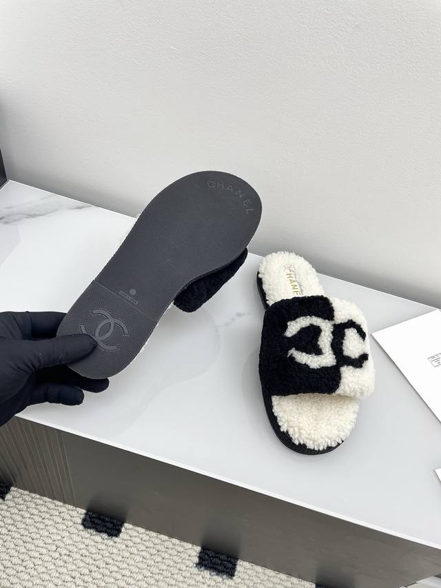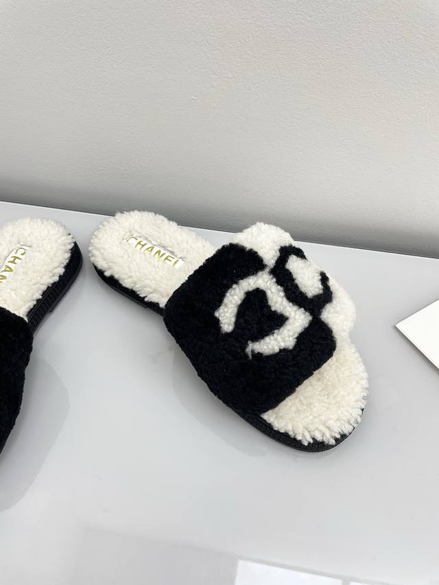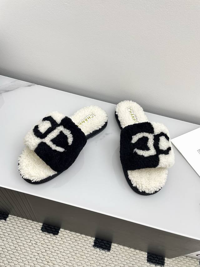 Chane* 小香秋冬新款经典双C拼色毛毛拖鞋 这款毛拖真的是真太可爱了~ 柔软蓬松的毛毛,舒服暖脚美腻美爆了 鞋面:进口澳洲真羊毛,手感细腻柔软丝滑 大底:原