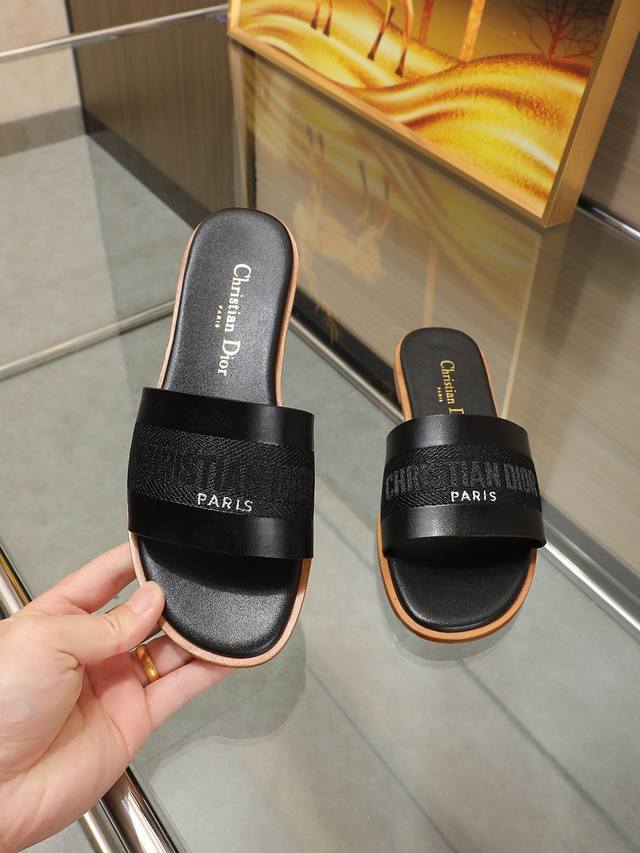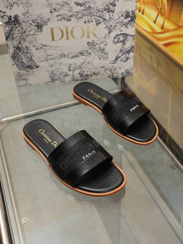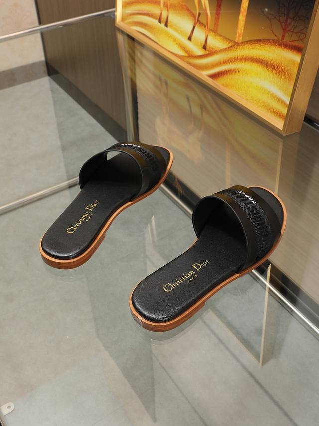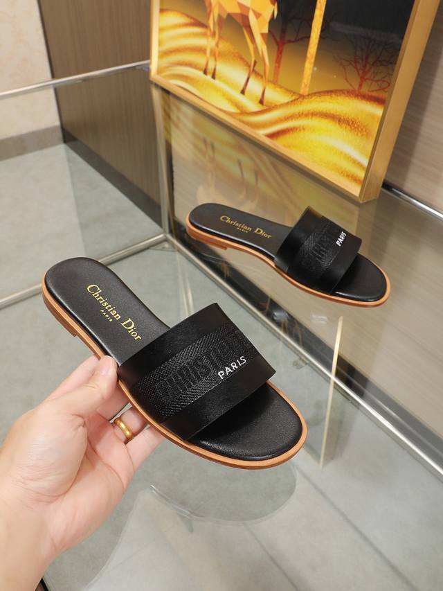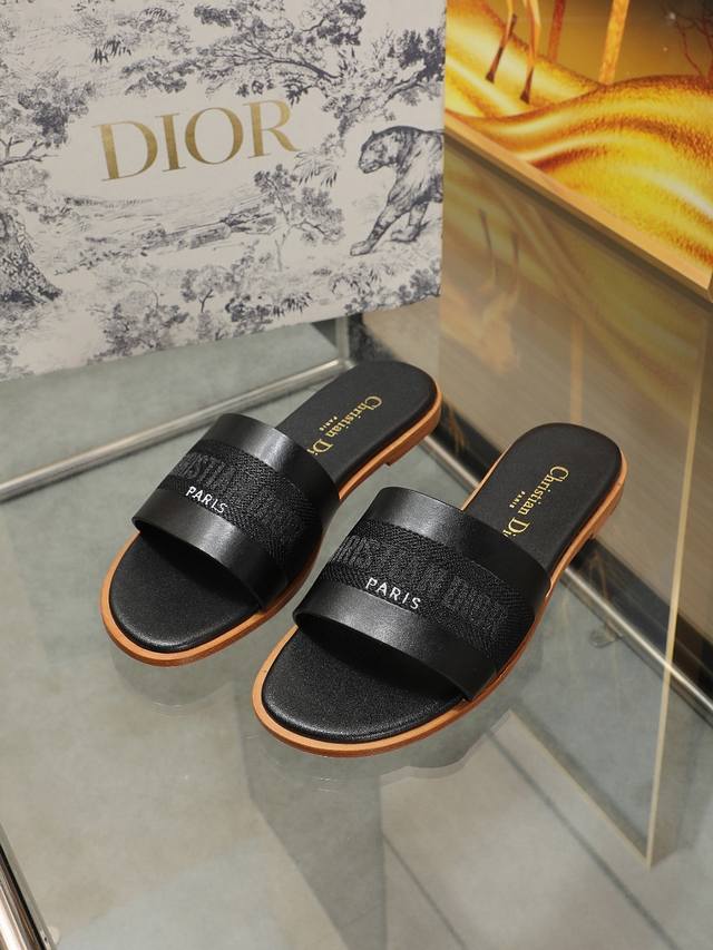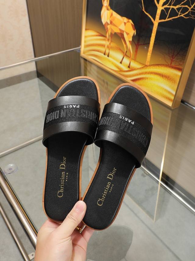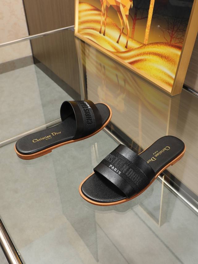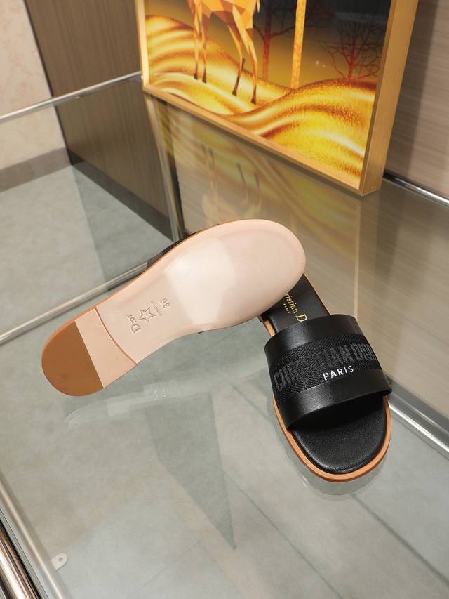 Dior迪奥平底一字拖鞋,牛皮鞋面电绣编织,刺绣字母,内里垫脚羊皮。真皮大底,码数:35-42