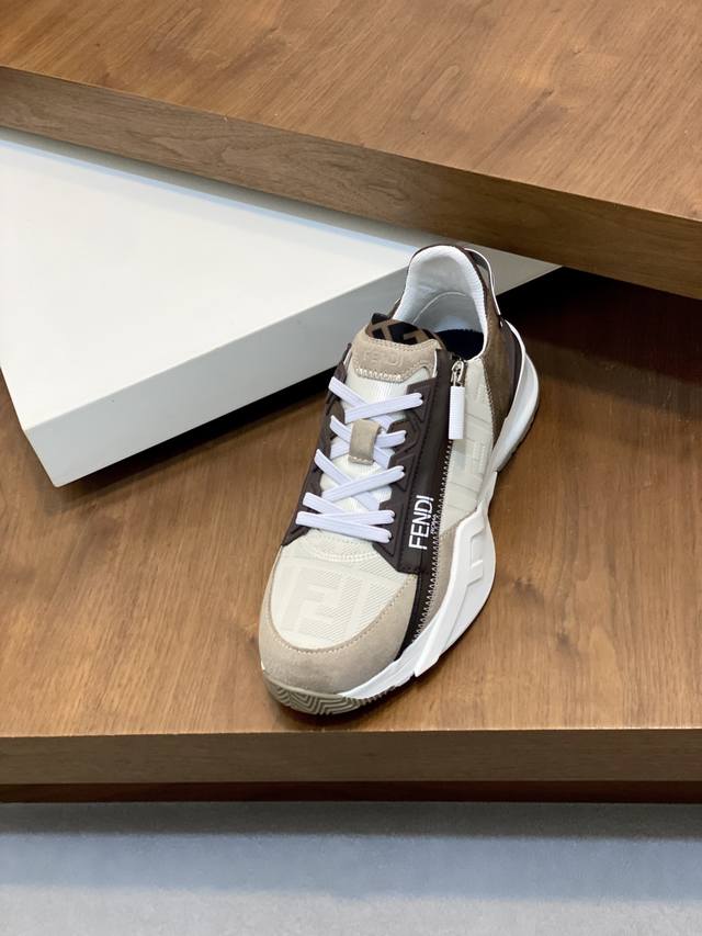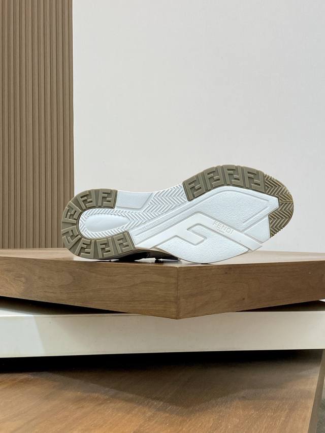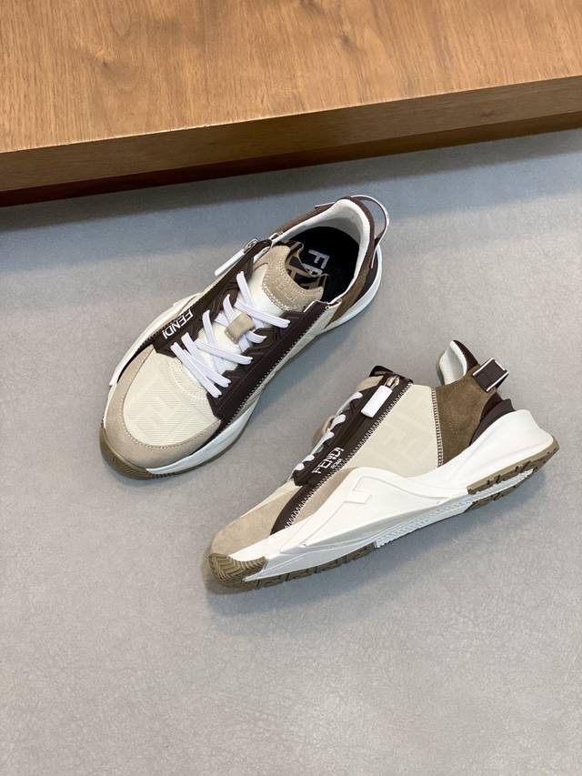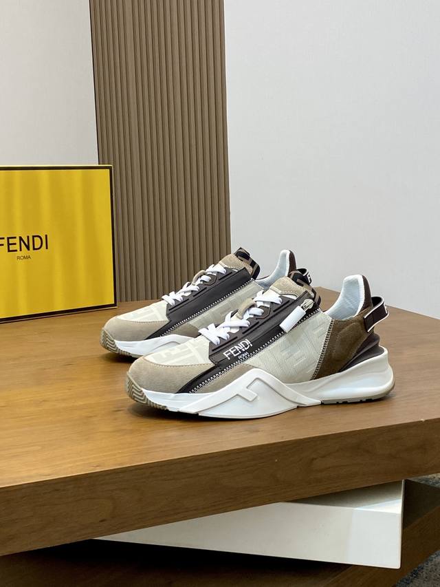 Fend* 芬迪 芬家Flow 男士休闲运动鞋,搭配松紧带、侧拉链,刻有F的波纹鞋底。鞋跟饰有凸纹Fendi Flow字样。高科技布料及蓝色和真皮混合材质。装饰Lycra细节。Ff图案鞋舌。超轻耐磨Eva鞋底。