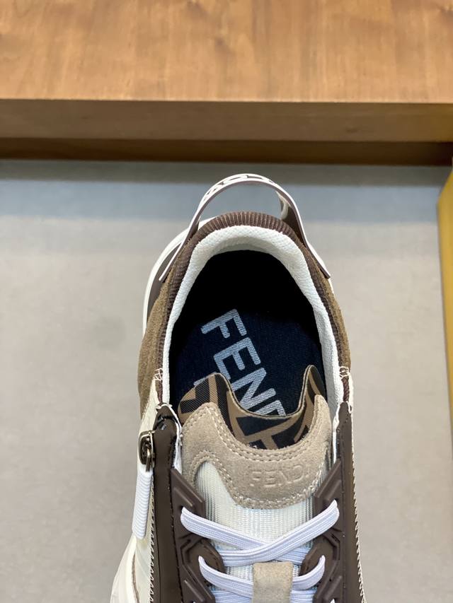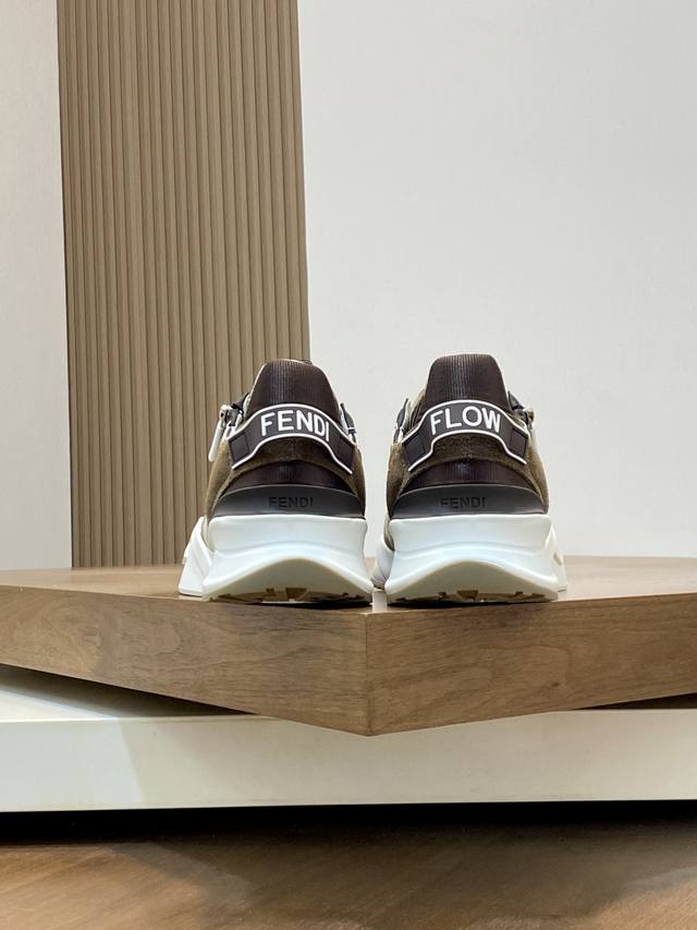 / Fend* 芬迪 芬家Flow 男士休闲运动鞋,搭配松紧带、侧拉链,刻有F的波纹鞋底。鞋跟饰有凸纹Fendi Flow字样。高科技布料及蓝色和真皮混合材质。装饰