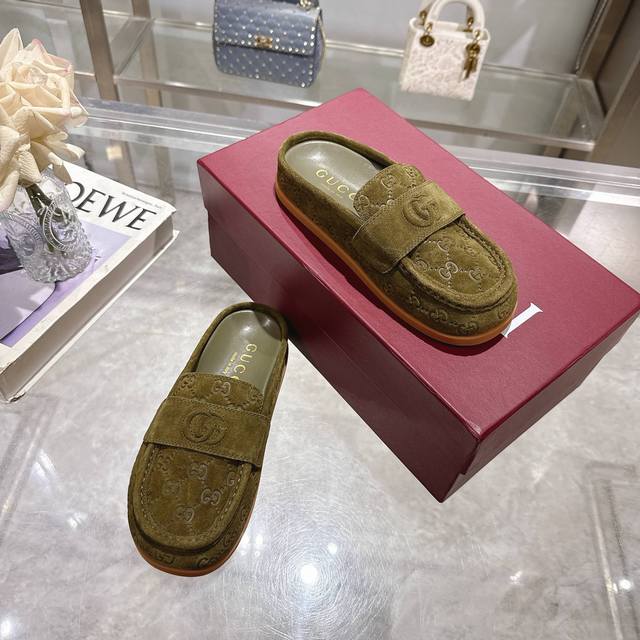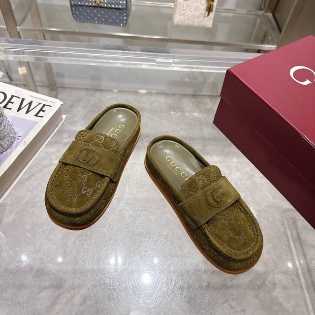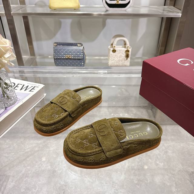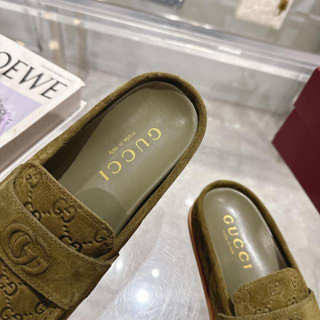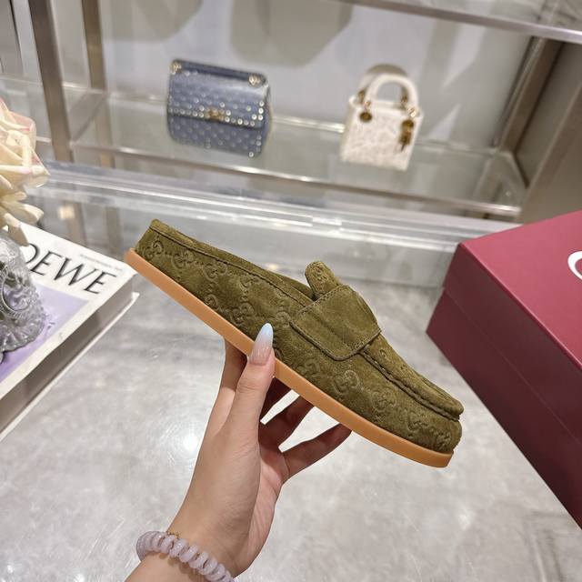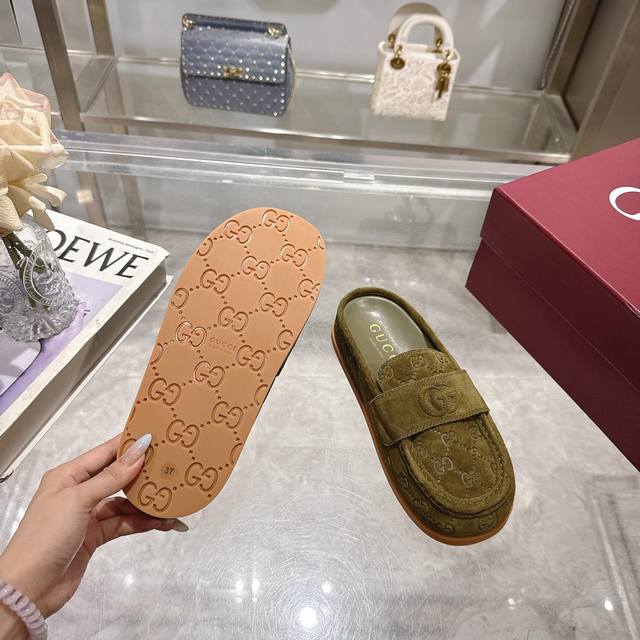 Gg早春爆款穆勒鞋!拖鞋!采用柔软绒面皮在意大利制成,鞋面压印品牌标志性双G字母,横扣带上刺“”绣“Gg”Logo图案。萌萌圆鞋头点缀手工凸缝线迹橡胶鞋底增添抓地力。一脚蹬套穿方便实用全套包装35-40 军绿色