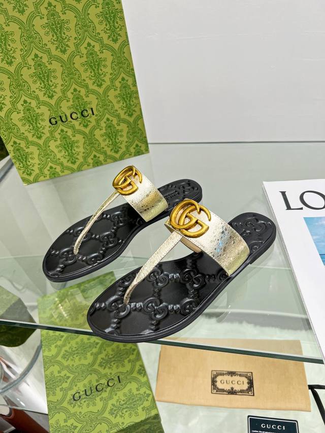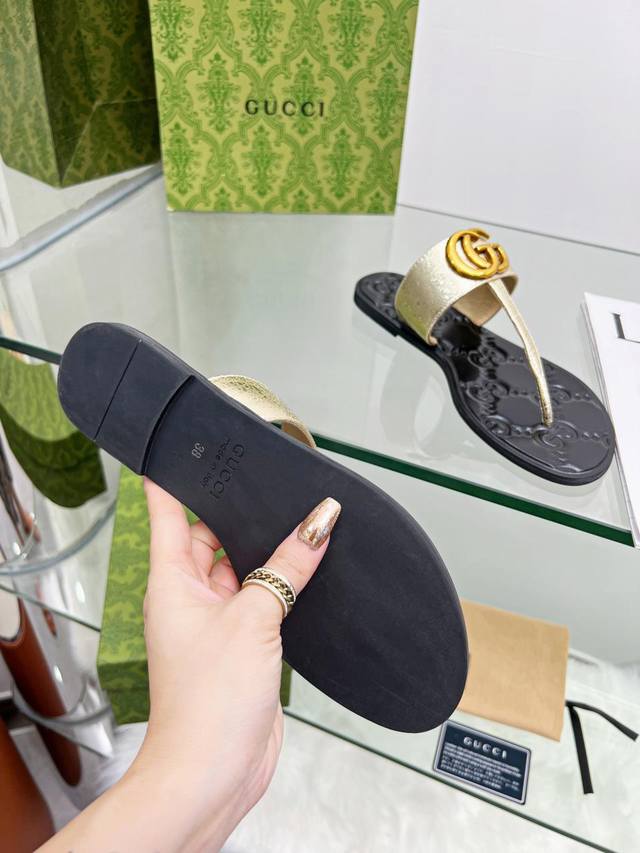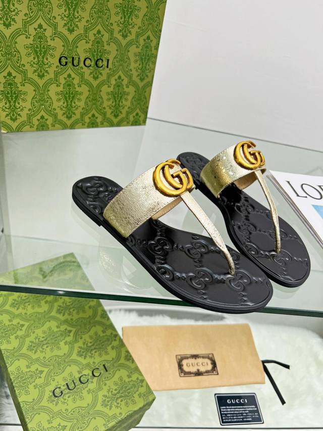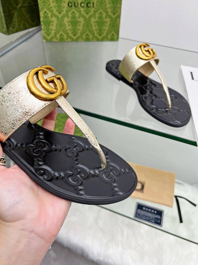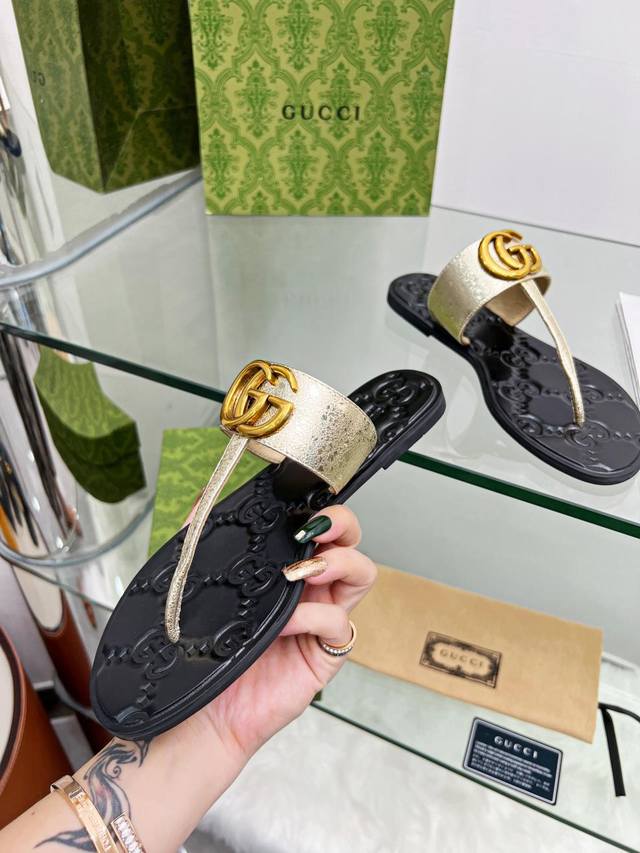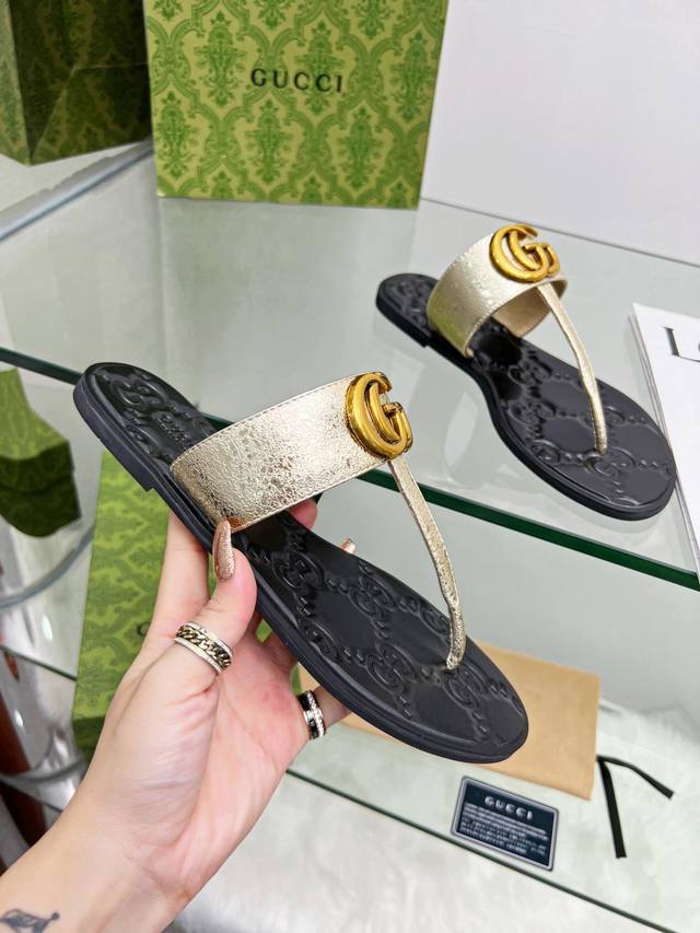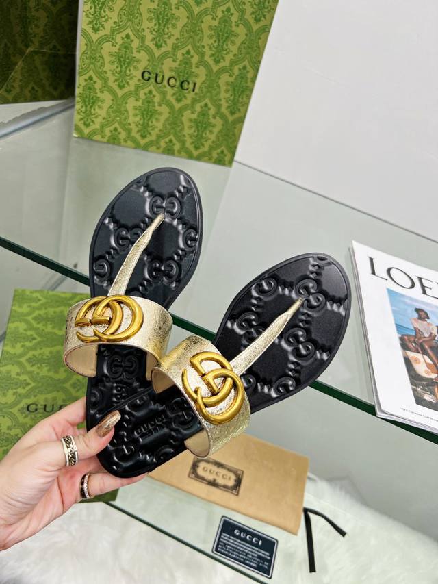 / Gucc!古奇最新款平底夹脚拖鞋火爆上市。原版1:1复制。原版五金扣开模。 中低双G大Logo原版开模 穿脚特别舒服,大牌名星最爱的奢侈品。 鞋面:牛皮 内里: