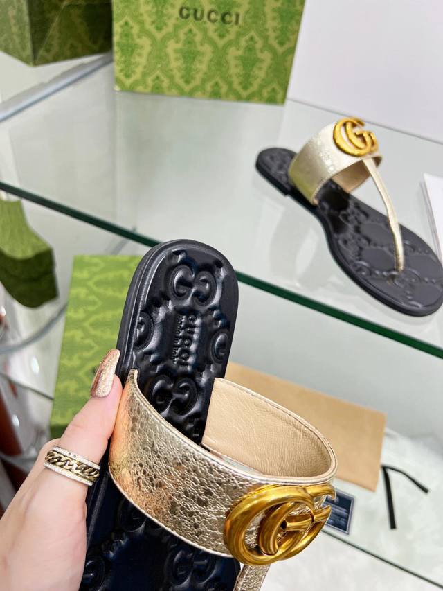 Gucc!古奇最新款平底夹脚拖鞋火爆上市。原版1:1复制。原版五金扣开模。 中低双G大Logo原版开模 穿脚特别舒服,大牌名星最爱的奢侈品。