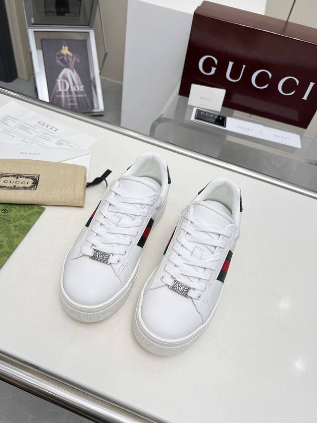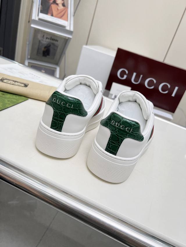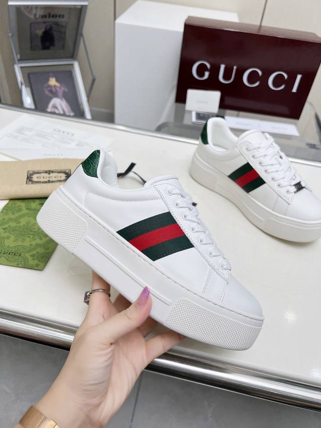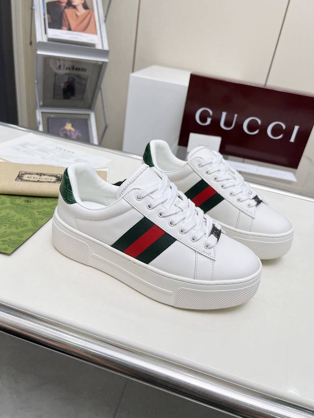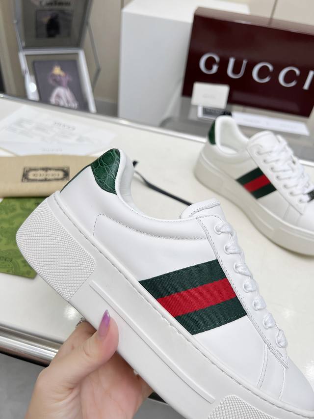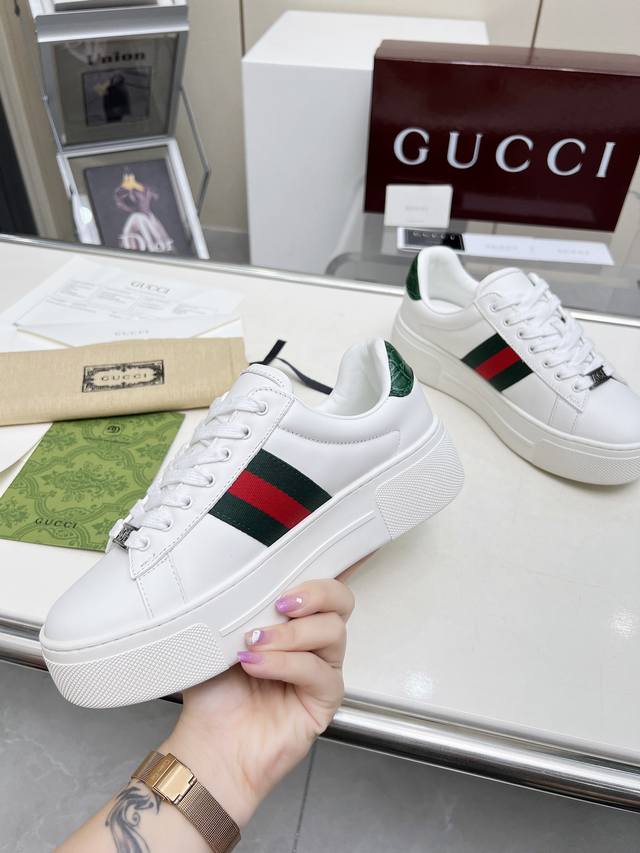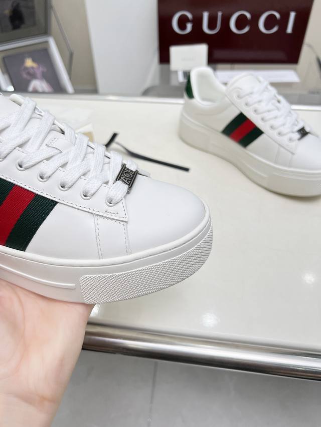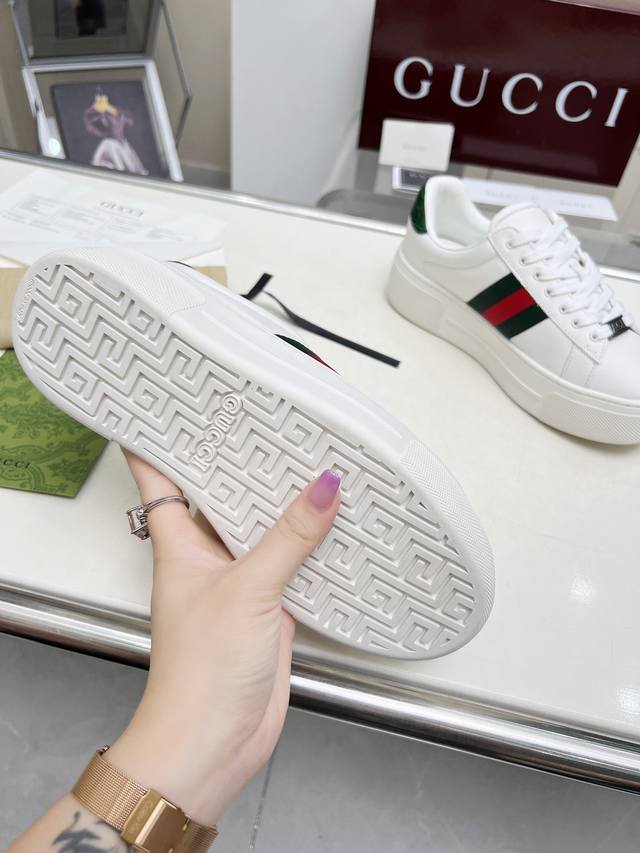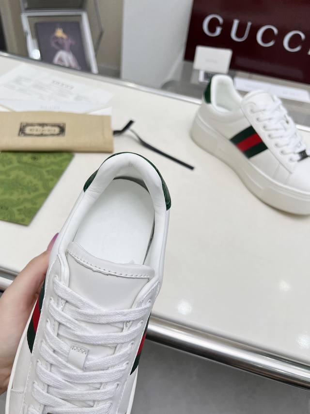 Gucci经典小白鞋,重磅回归女码35-40 男码39-45 面料:进口头层牛皮 内里:牛皮里 垫脚:牛皮垫 大底:Tpu大底 工艺:原板套包 :