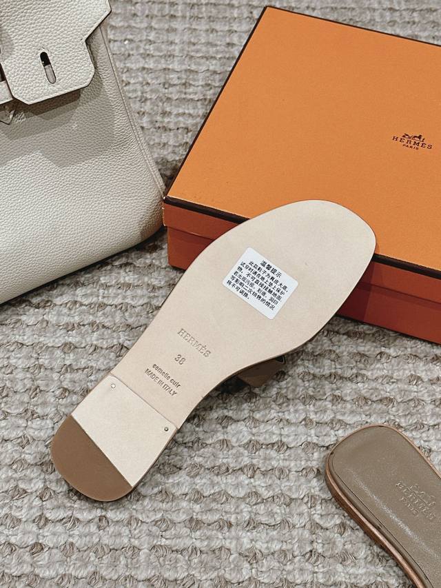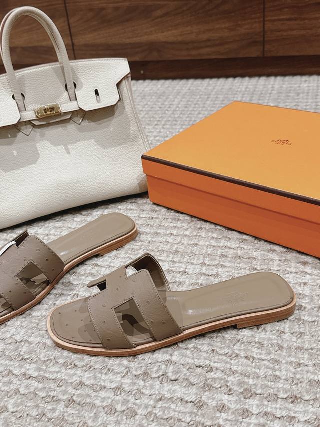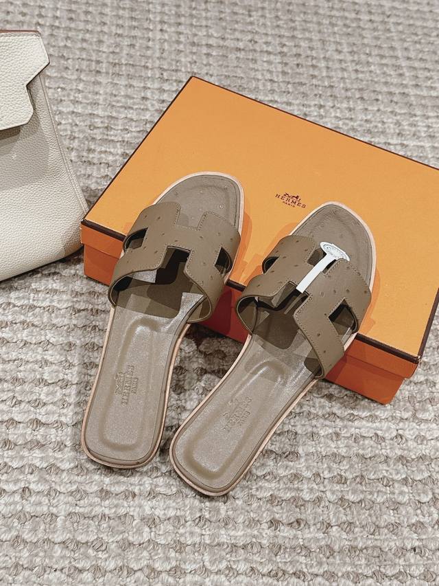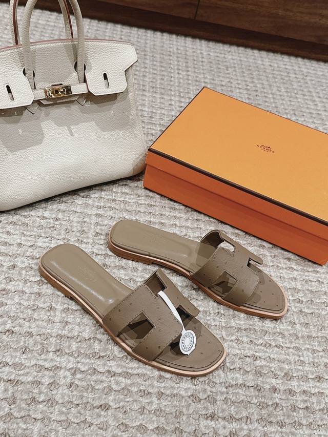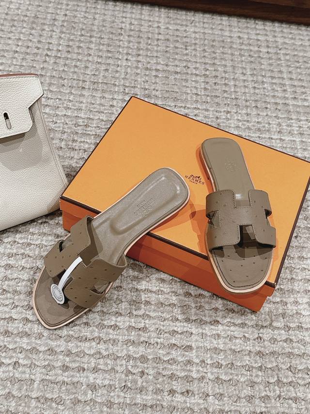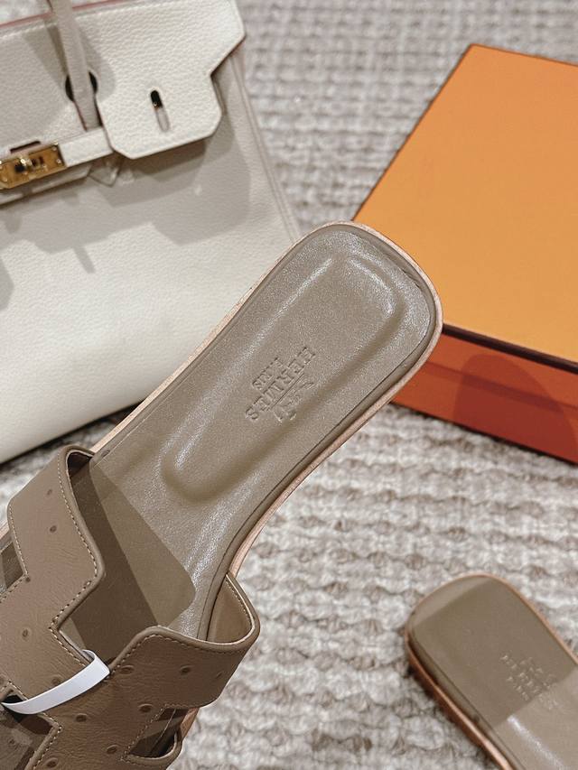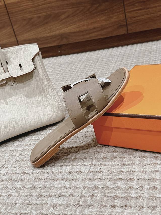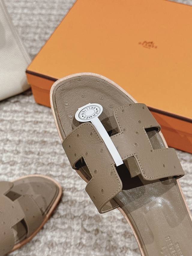 Hermes 爱马仕Oasis凉鞋系列 时尚又百搭 超级舒服 每个细节都做到极致 原版鸵鸟皮 原版1:1独家私模鞋面 原版真皮大底 包装:每对均配两条H家Vip