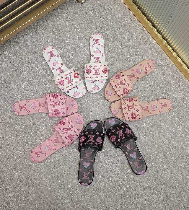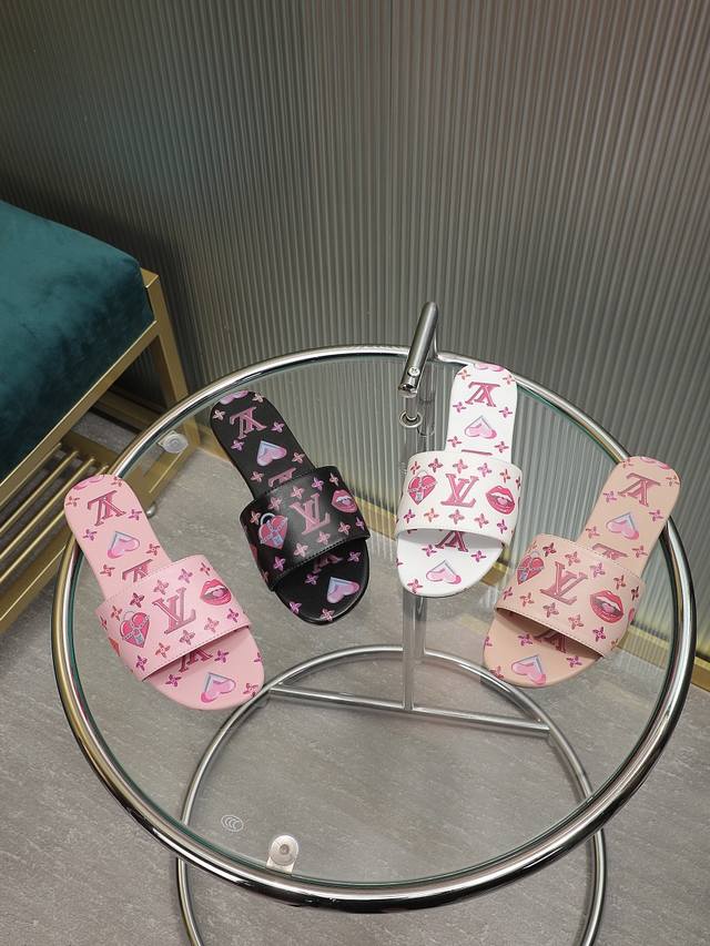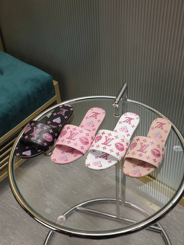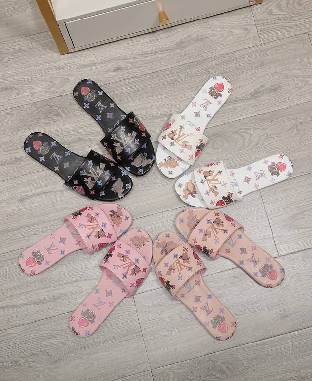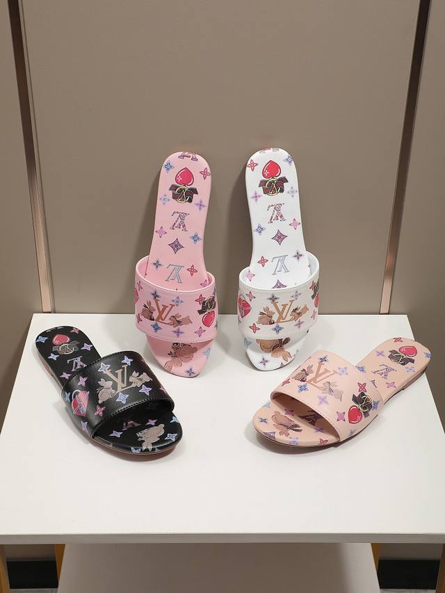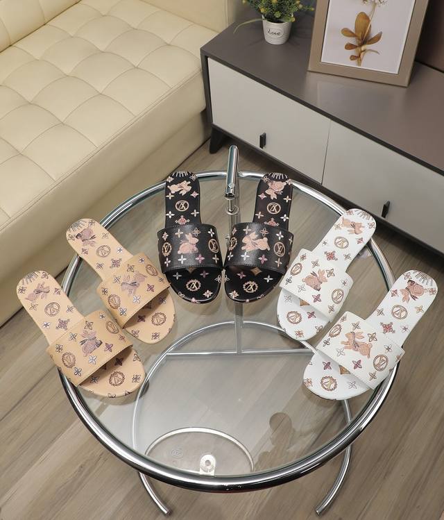 Lv新款平低一字拖,5D打印玉兔花纹,牛皮面羊皮里,意大利进口真皮底,码数35 41