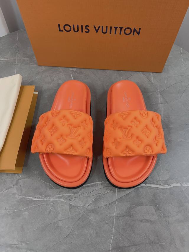 / Lv驴牌L家 爆款 浮雕Logo 压花 凉拖鞋 本款 Pool Pillow Comfort 平底凉拖取材科技织物,以高频压印技术重绎 Monogram 图案。