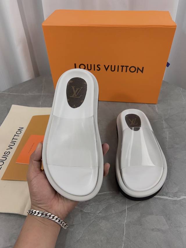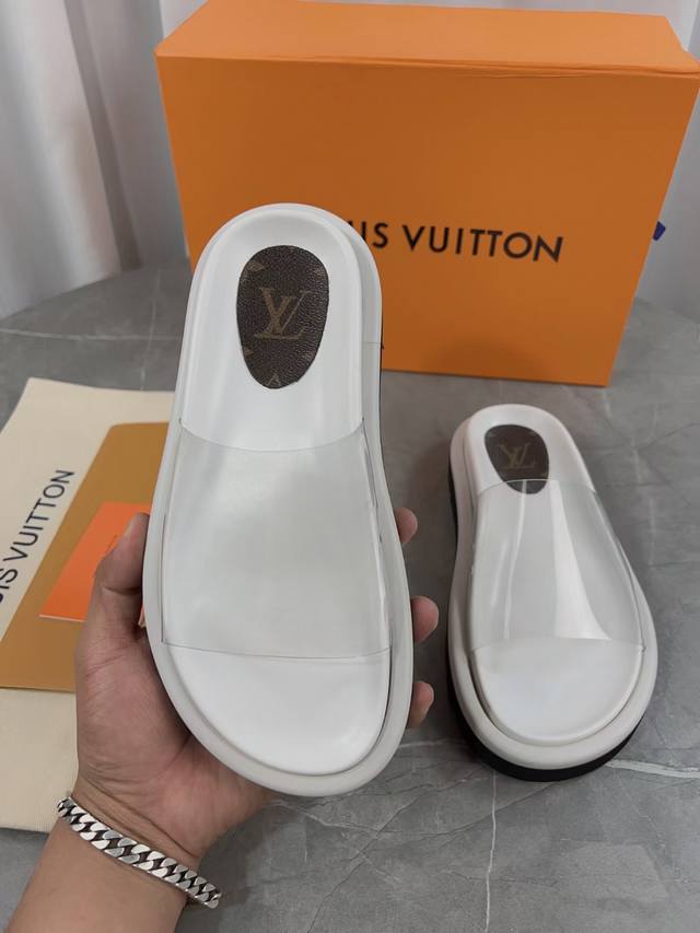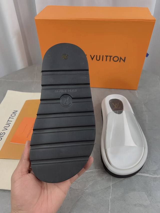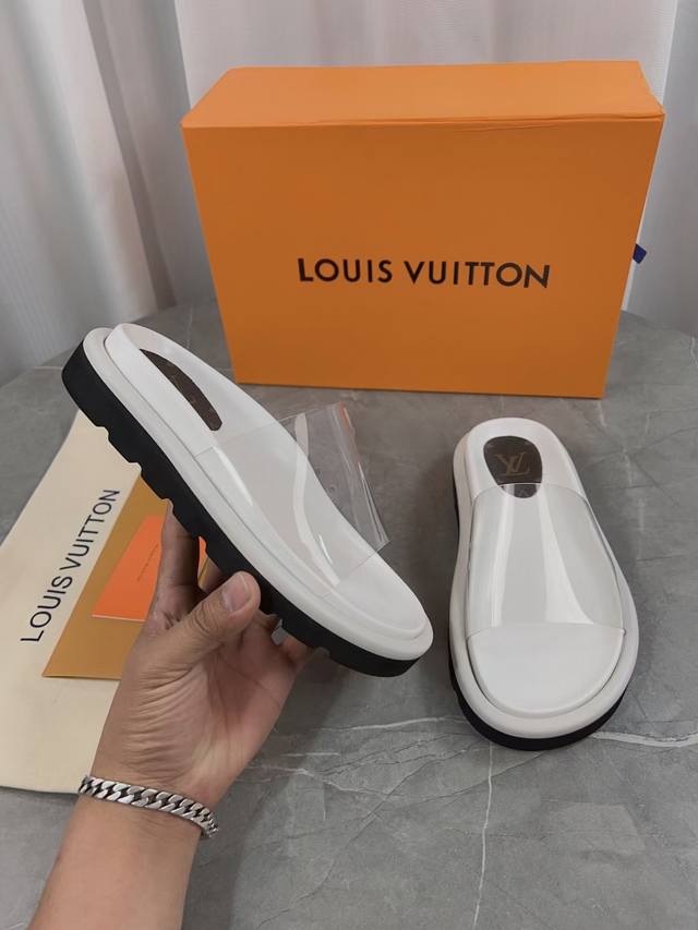 Lv 春夏新款拖鞋皮带扣子可调松紧的设计 满满的沙滩风情 原版开模Lv金属Logo装饰 既时尚又美观超级百搭鞋面透明胶片 Size: 女35-43男:38-46