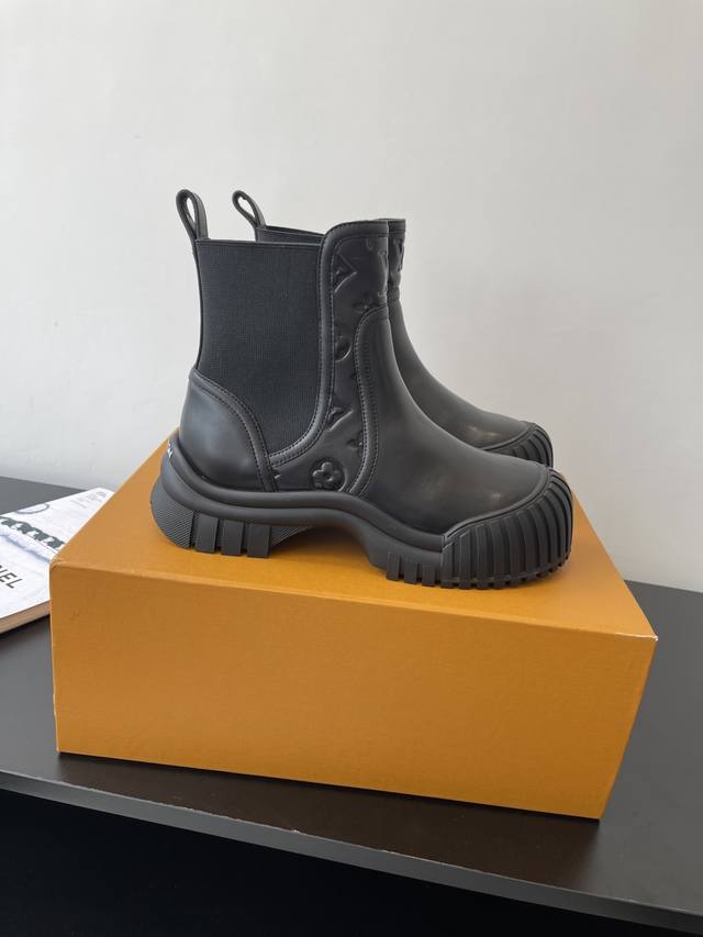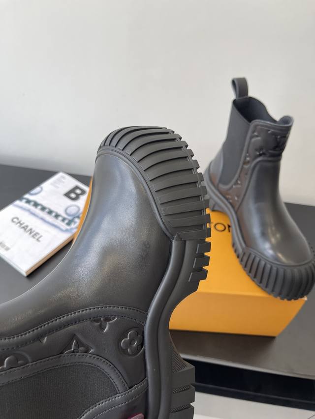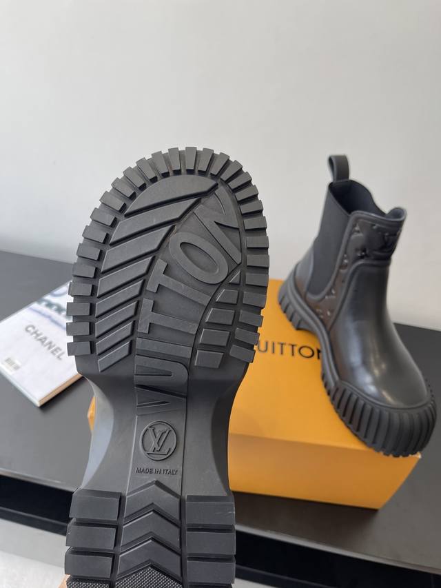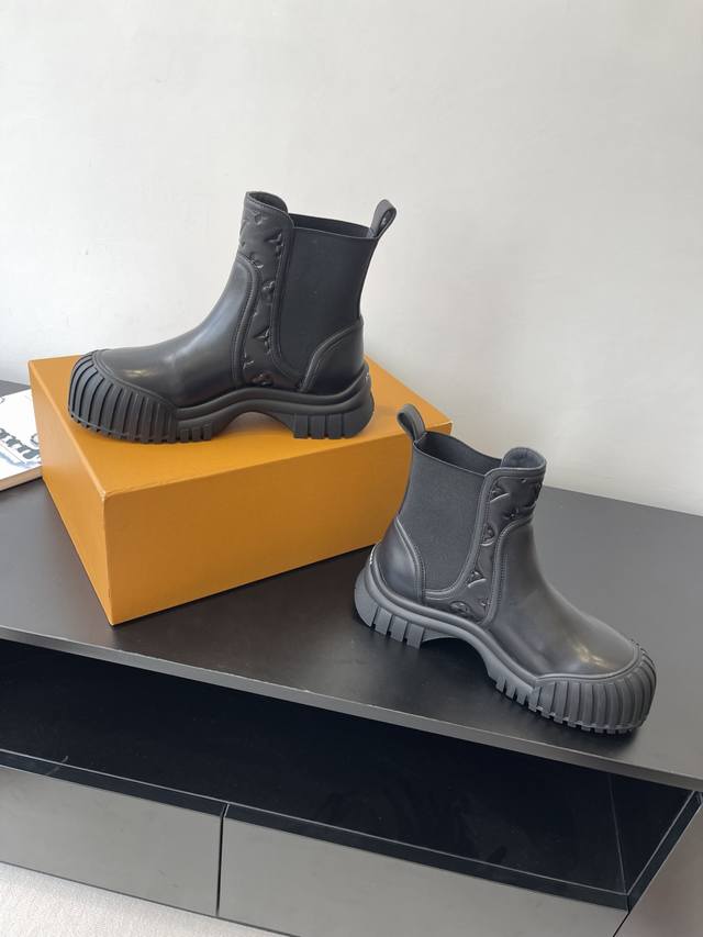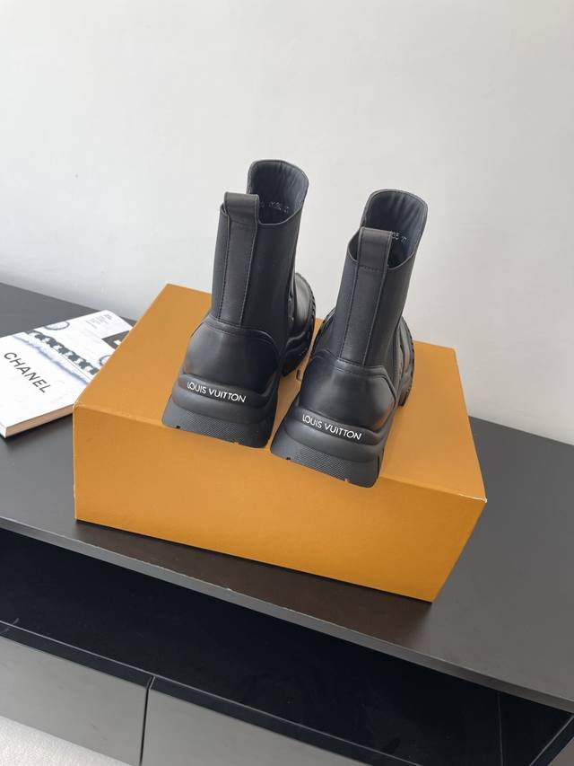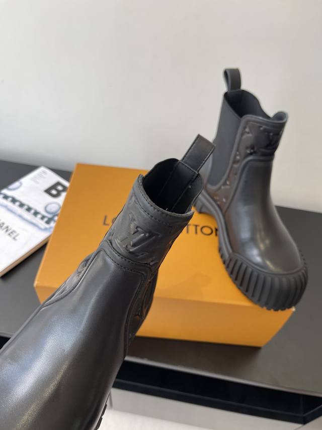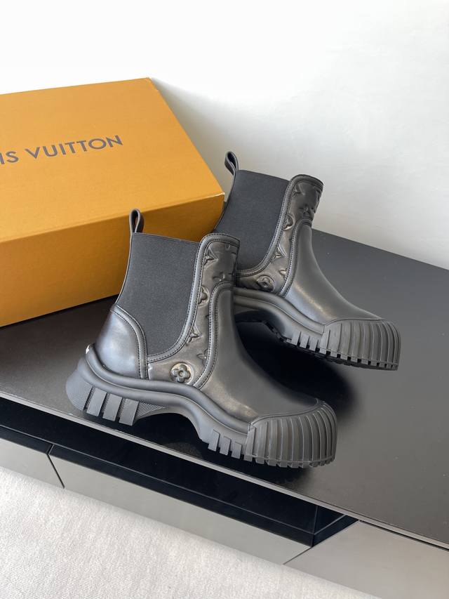 Ruby 平底切尔西及踝靴为牛皮革搭配厚实的竖纹橡胶外底 以前卫笔触演绎切尔西靴的经典设计 正面 Lv Circle 橡胶标识和后部路易威登标识一道彰显品牌格调