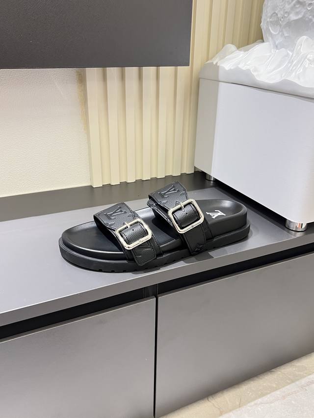 / L.V 驴家高端男士夏季拖鞋, 经典老花系列,一字带宽松设计,别致的色彩拼接效果,个性鲜明,时尚潮流穿搭必备款式,轻盈舒适。轻质韧性橡胶内底,微型凸纹发泡外底,