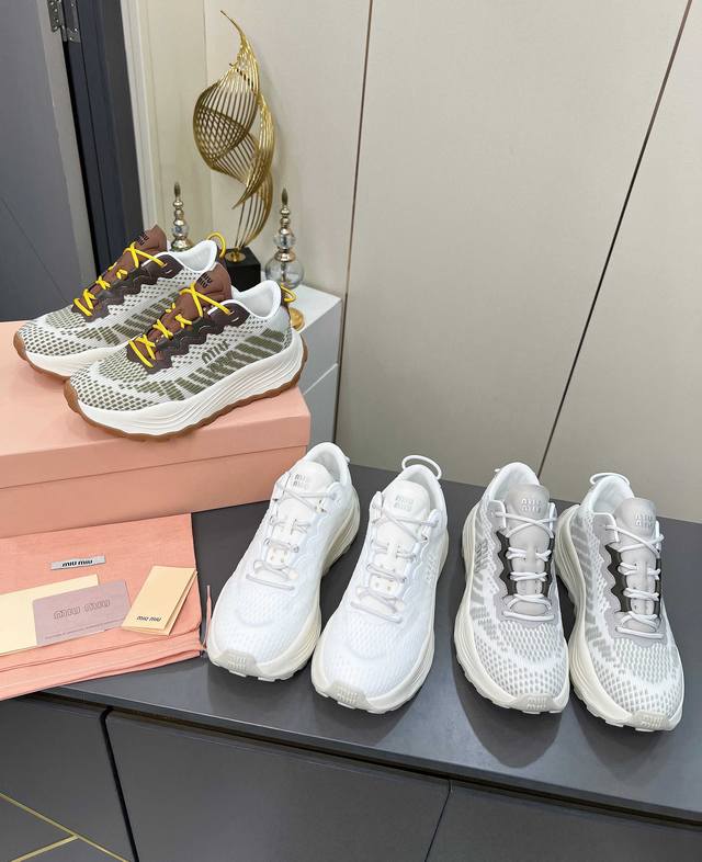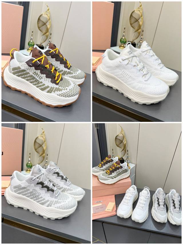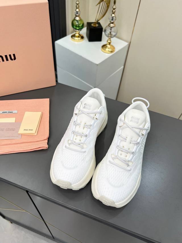 / Miumiu 缪缪2025春夏时尚新品,透气针织运动网鞋,厚底增高,体现了Miu Miu 的大胆特色,尽展女士魅力,简约线条 ,别致鞋面徽标饰,现代风格简约高级