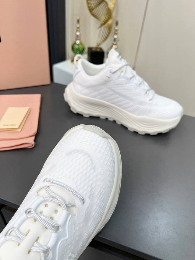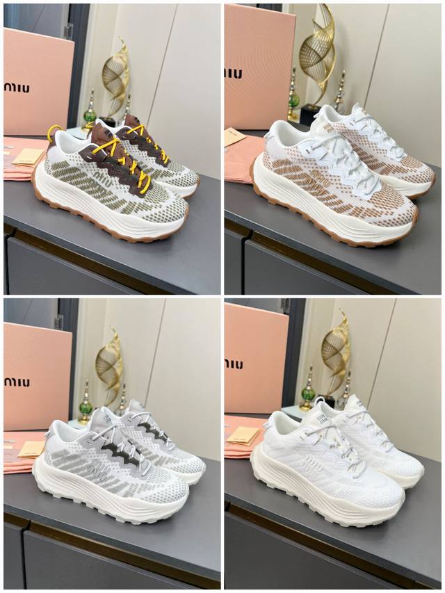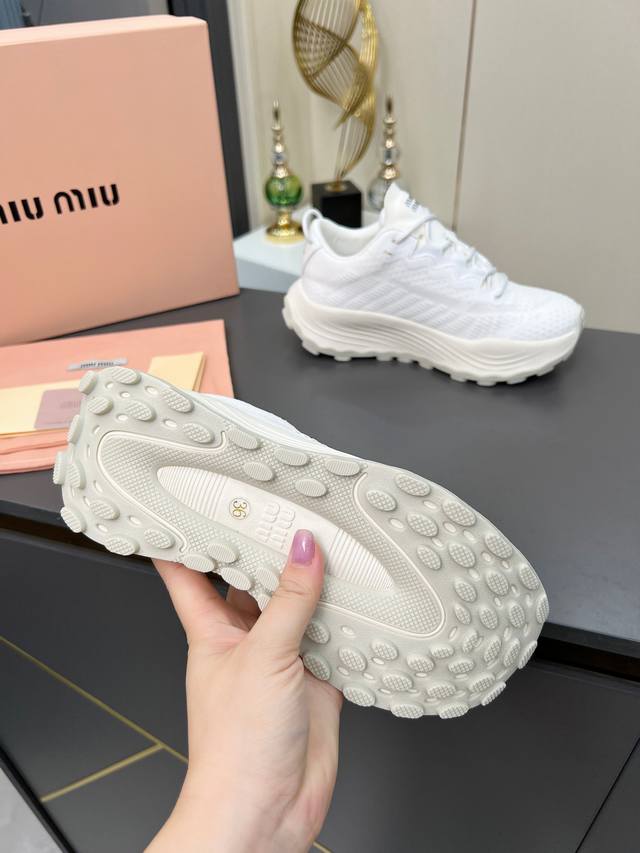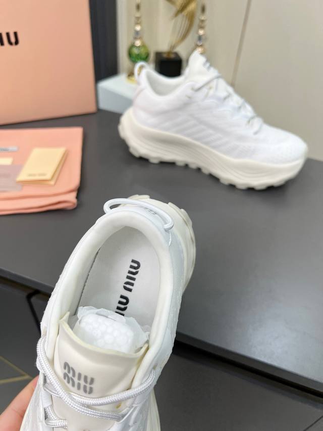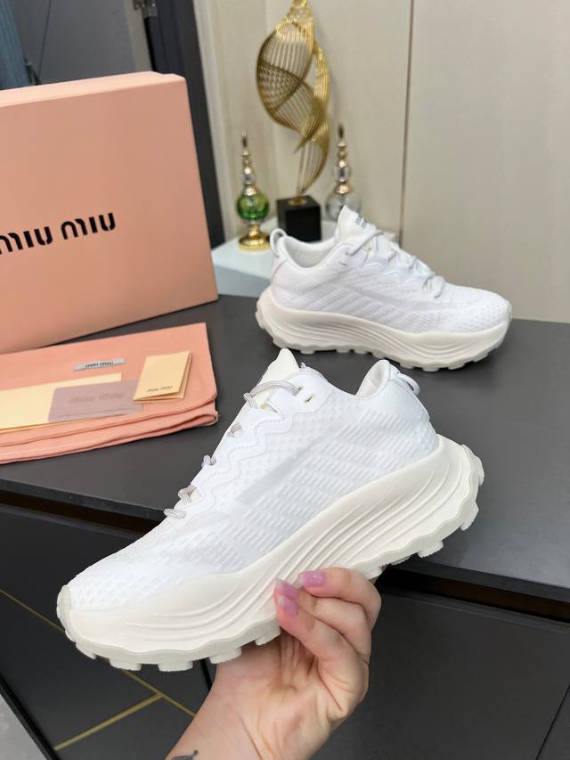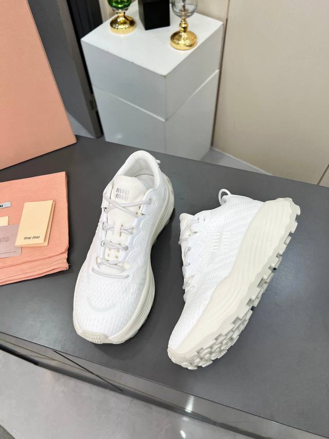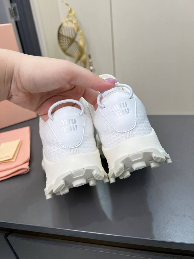 Miumiu 缪缪2025春夏时尚新品,透气针织运动网鞋,厚底增高,体现了Miu Miu 的大胆特色,尽展女士魅力,简约线条 ,别致鞋面徽标饰,现代风格简约高级 轻松搭配,尽显女士风彩,上脚特别轻松舒适又百搭
