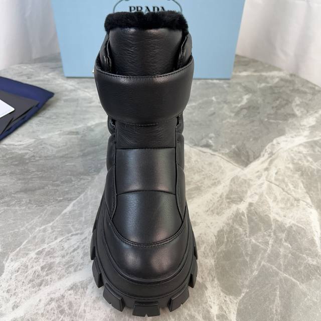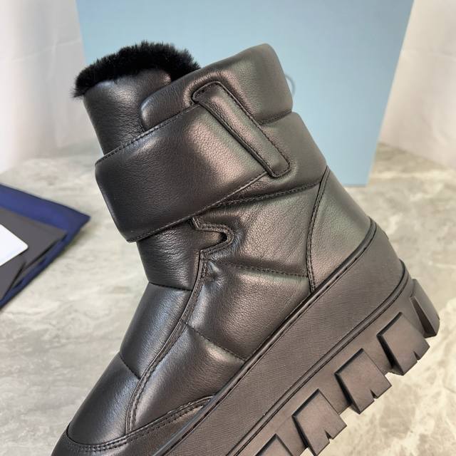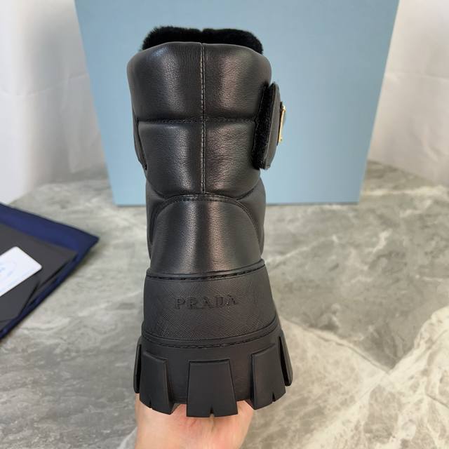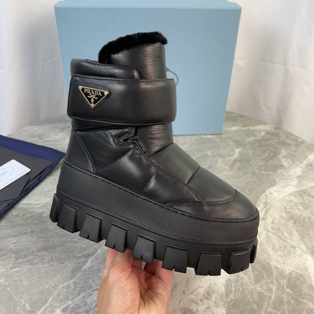 P家最新款,顶级版本。 面:进口超软牛皮 里:皮毛一体纯真羊毛 垫:纯羊毛 底:防滑花纹橡胶底 厚4.5Cm 标志性三角标,原版包装 Size:35-42