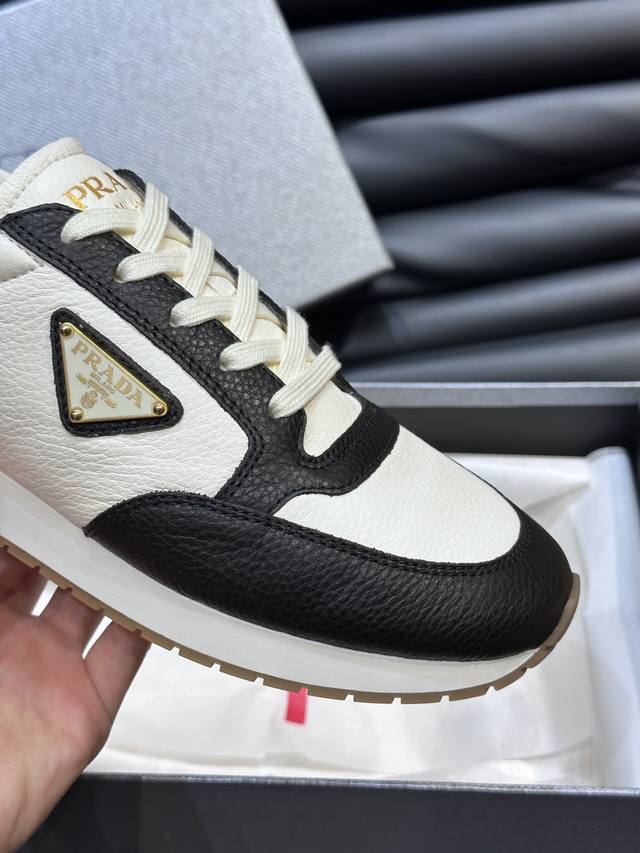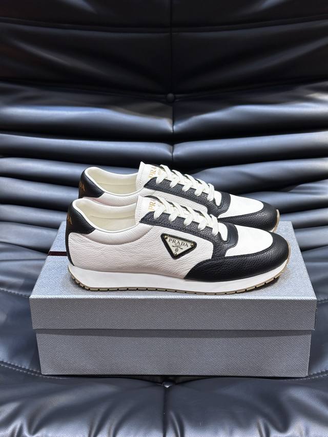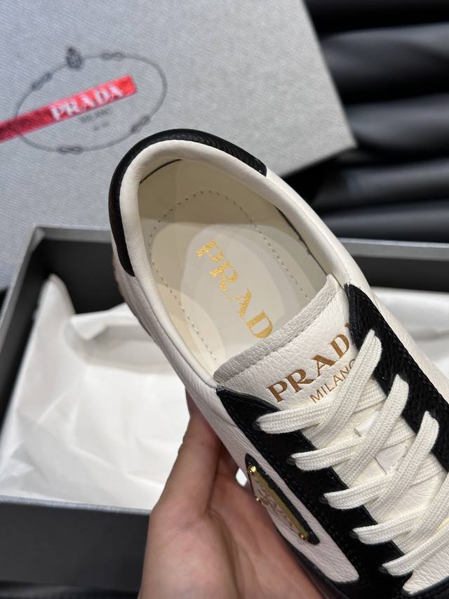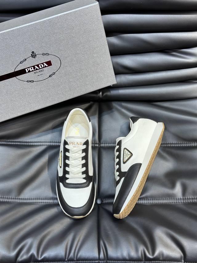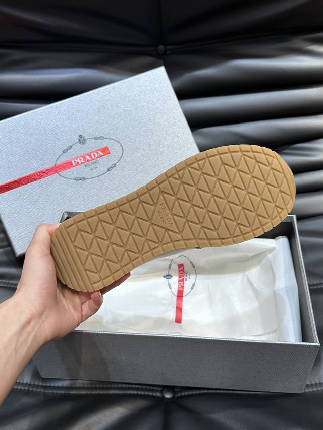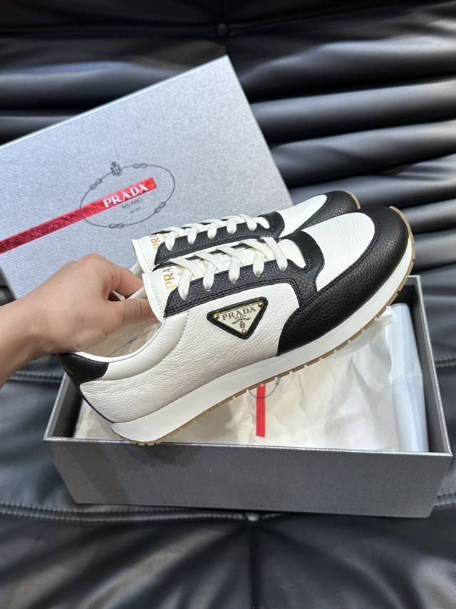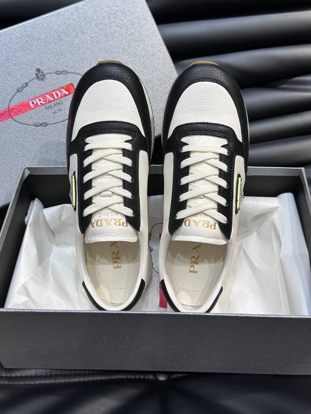 Prad* 普拉达新品男士高端运动鞋,这款运动鞋休闲百搭,选用进口牛皮打造,进口羊皮内里,轻质发泡大底,脚感非常舒适,运用柔和简洁的线条勾勒出运动风廓形。鞋底轻盈而稳固,带有标志性的涂珐琅三角形金属徽标,鞋舌饰有压花效果丝网印花徽标,彰显别具一格的魅力。