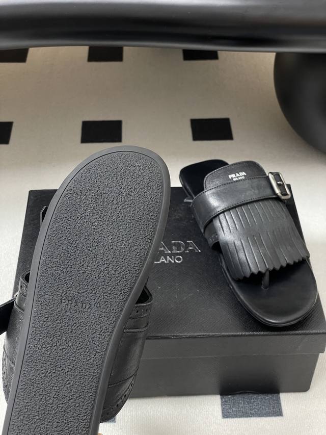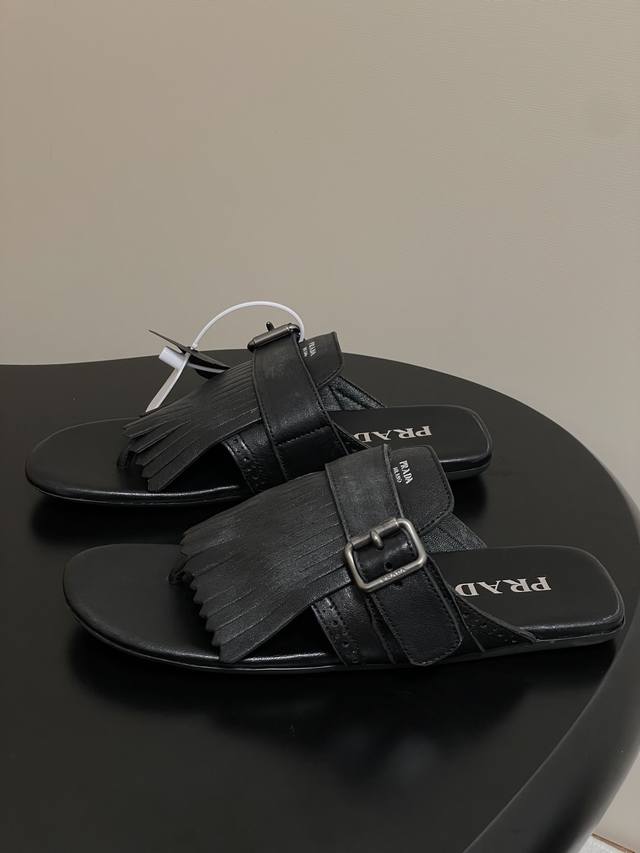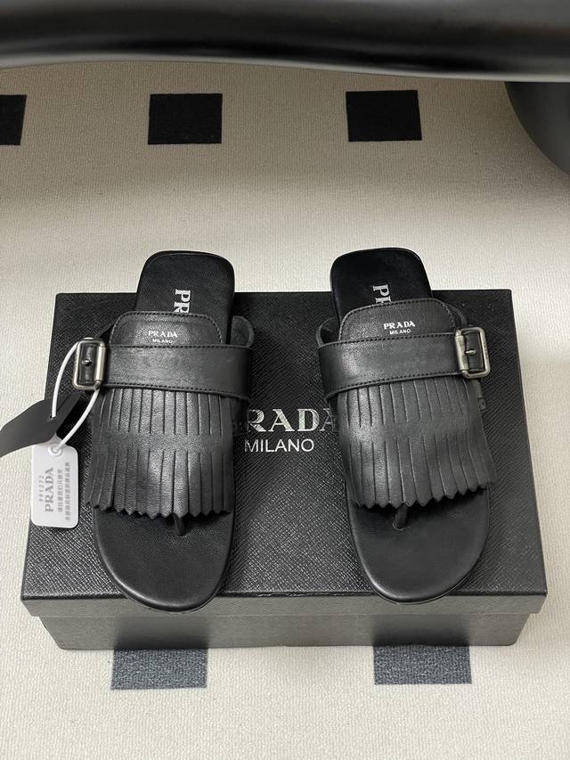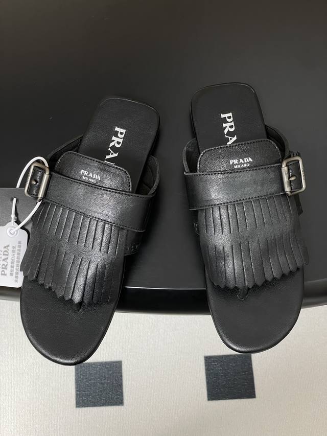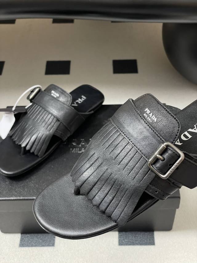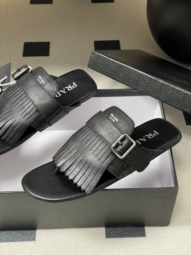 Prada普拉达 25S 走秀款复古流苏露趾夹脚 拖鞋休闲人字拖鞋