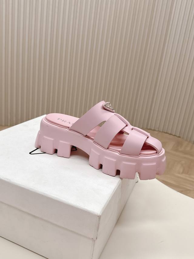 Prada普拉达2025春夏猪笼鞋锯齿罗马编织厚底橡胶拖鞋 复古时髦前卫的轮齿55Mm 厚底鞋底搭配橡胶鞋面,让整双鞋轻便舒适 鲜艳色彩 满足不同风格时髦人士的