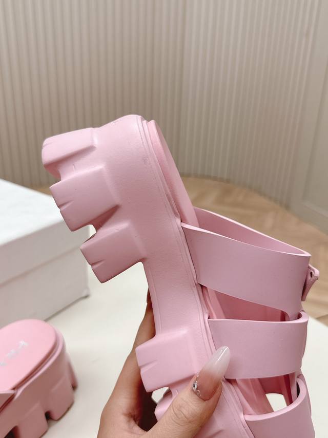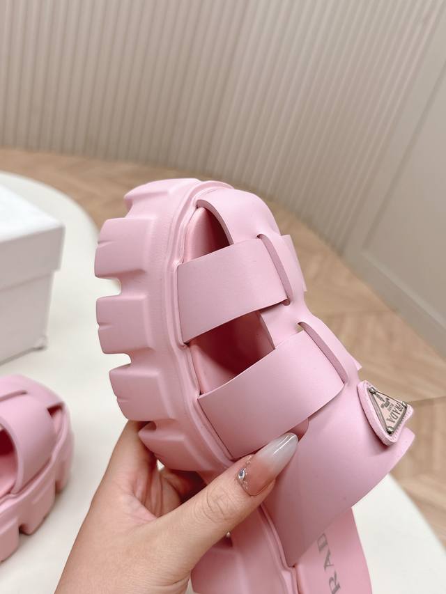 / Prada普拉达2025春夏猪笼鞋锯齿罗马编织厚底橡胶拖鞋 复古时髦前卫的轮齿55Mm 厚底鞋底搭配橡胶鞋面,让整双鞋轻便舒适 鲜艳色彩 满足不同风格时髦人士的