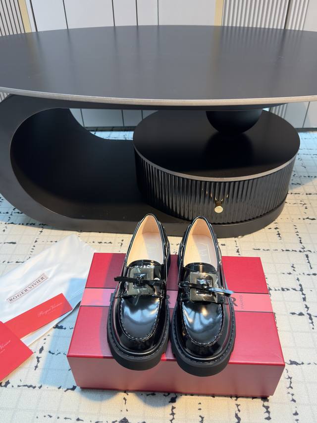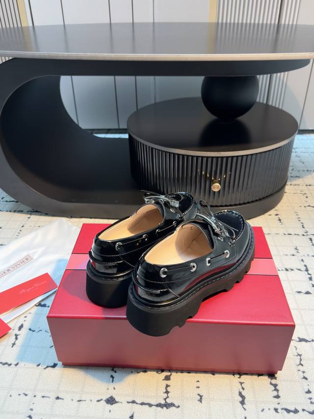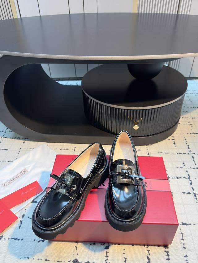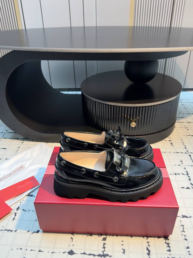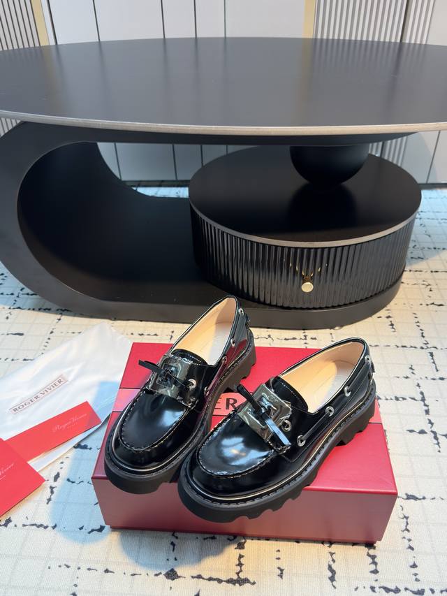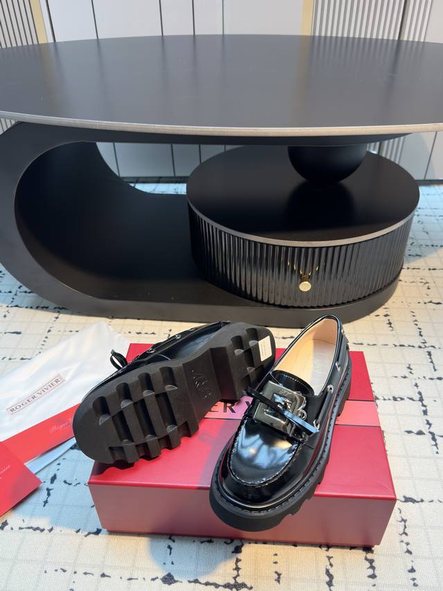 Rv新款乐福鞋 复古摩登感 设计灵感源自罗杰-维维亚的典藏设计,经典的锯齿鞋底经过重新演绎,焕发出时尚的现代气息。 尽显都市风格 本款皮革船鞋设有防滑厚底 点缀标志性饰扣 轻松为任意造型增添个性细节
