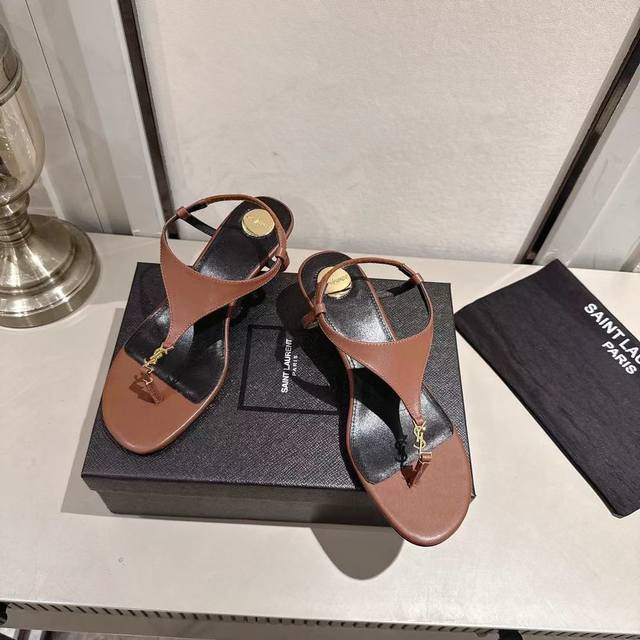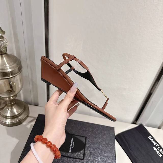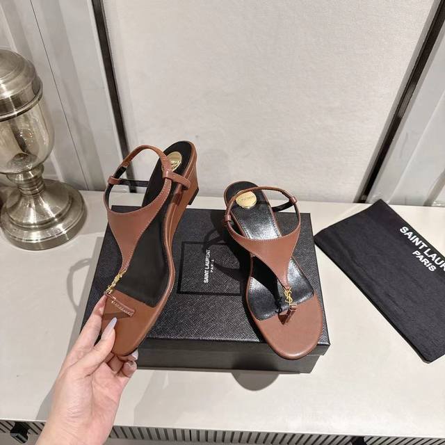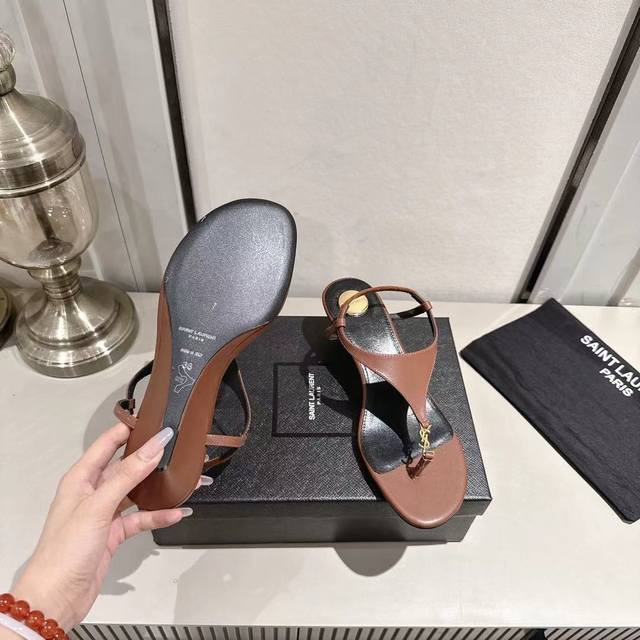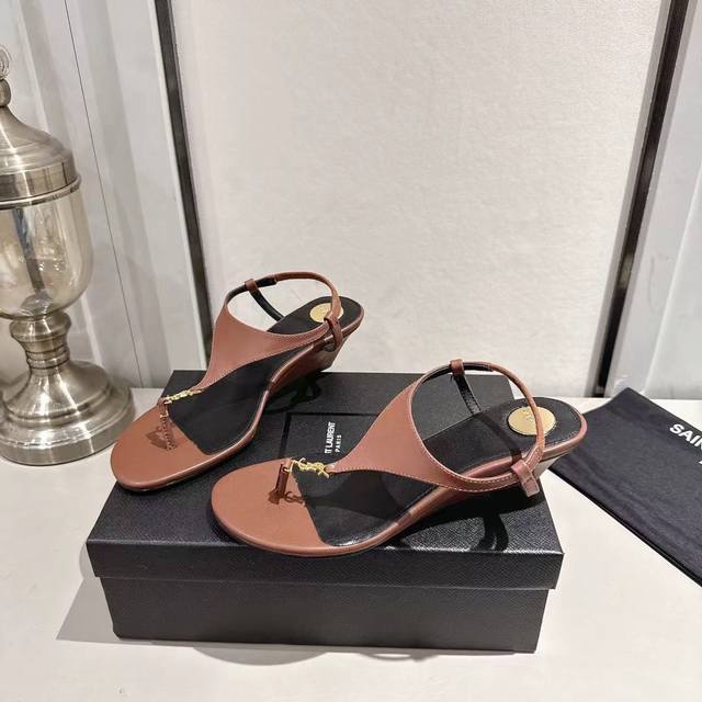 Ysl夹趾坡跟凉鞋2025新版 红棕色牛皮 跟高4.5Cn 码数35-44 35.43.44订做 橡胶大底 真皮大底