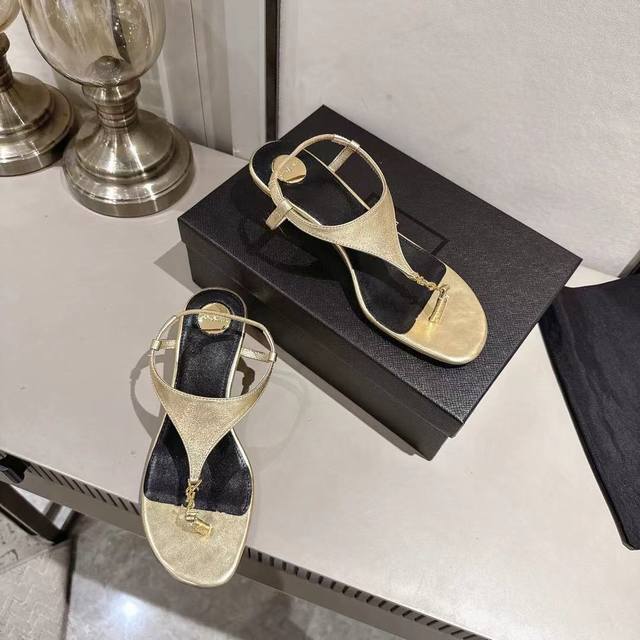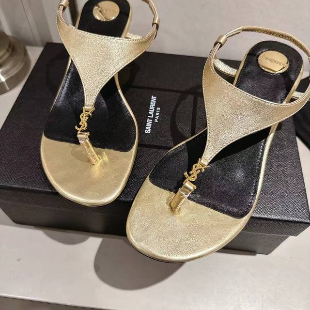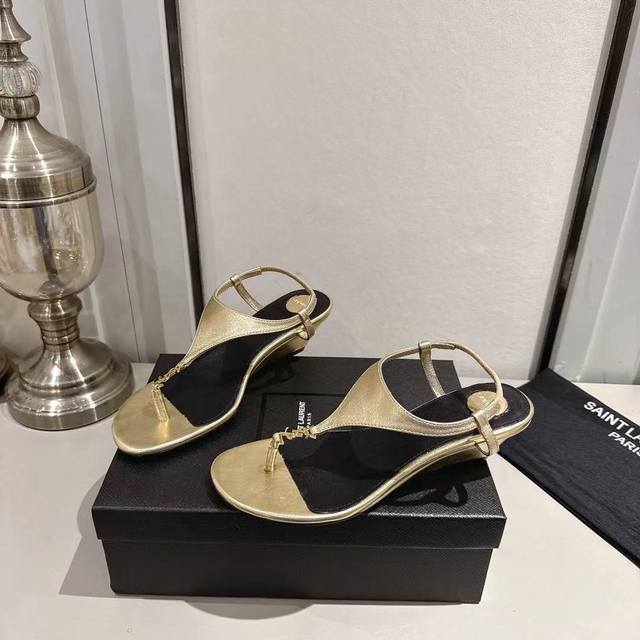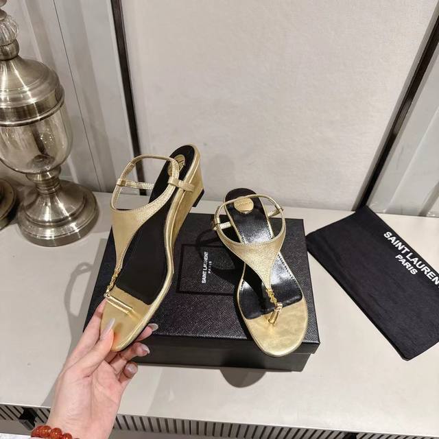 Ysl夹趾坡跟凉鞋2025新版 金色牛皮 跟高4.5Cn 码数35-44 35.43.44订做 橡胶大底 真皮大底