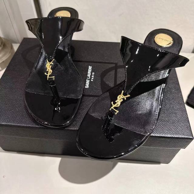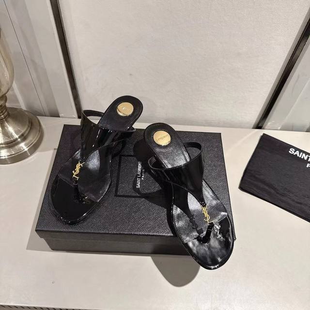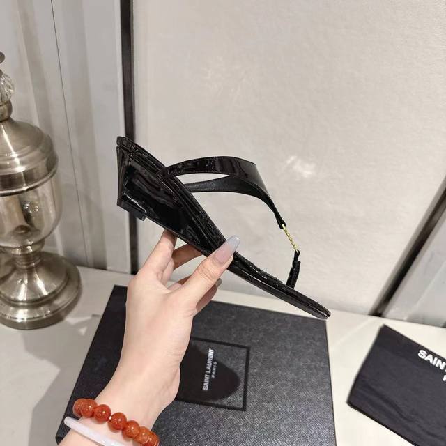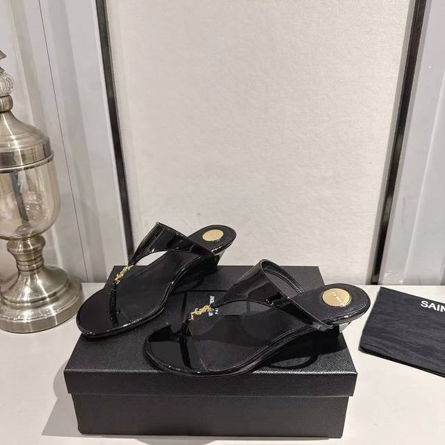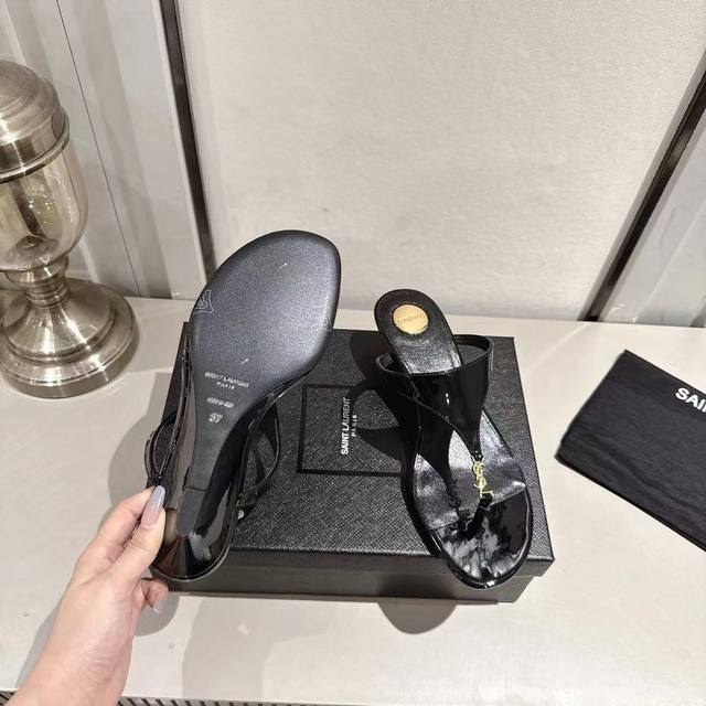 Ysl夹趾坡跟拖鞋2025新版 黑色漆皮 跟高4.5Cn 码数35-44 35.43.44订做 橡胶大底 真皮大底