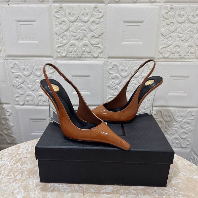 Ysl.顶级版本.高品质. 配置全套包装 2025新款 官网同步 1:1开模坡跟高跟鞋 鞋面:漆皮 内里:羊皮 跟高: 10.5 大底:A级原版黑色真皮大底 码