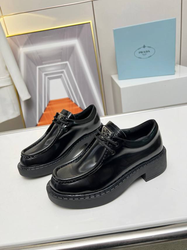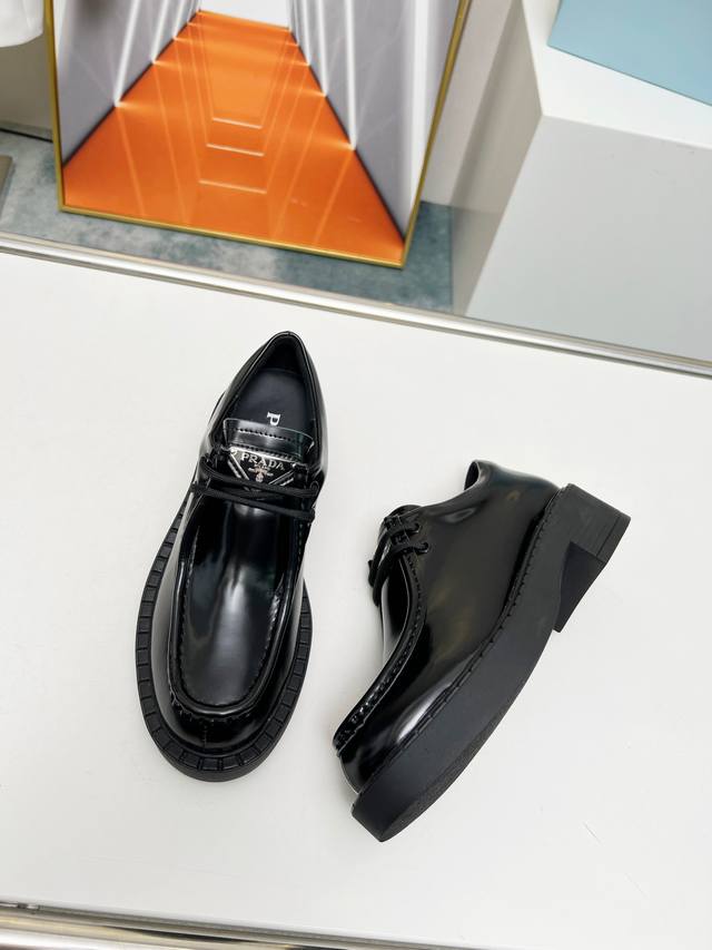 出厂价P 普拉达 春秋新款黑色开边朱漆皮厚底休闲小皮鞋,刘雯众多网红上脚,Prad这款松糕厚底鞋今年非常爆,穿上 增高...