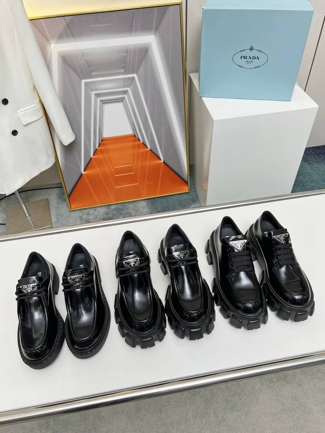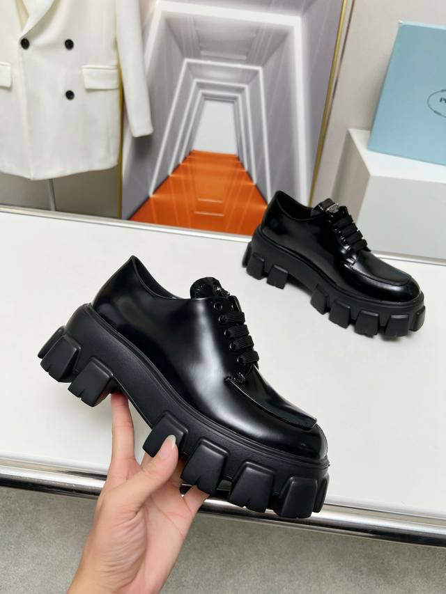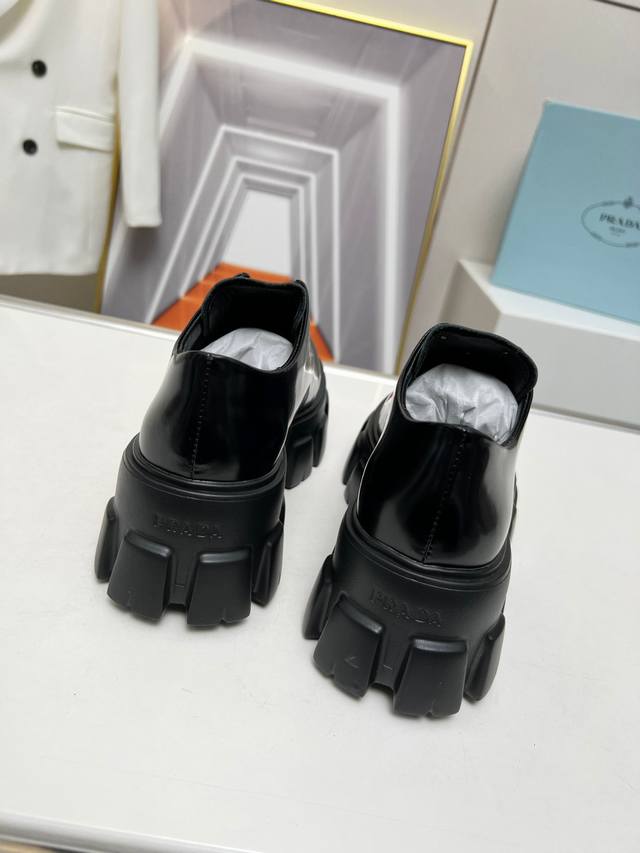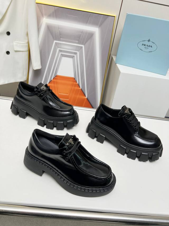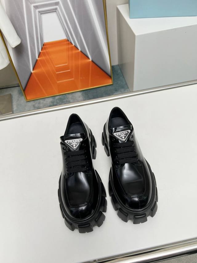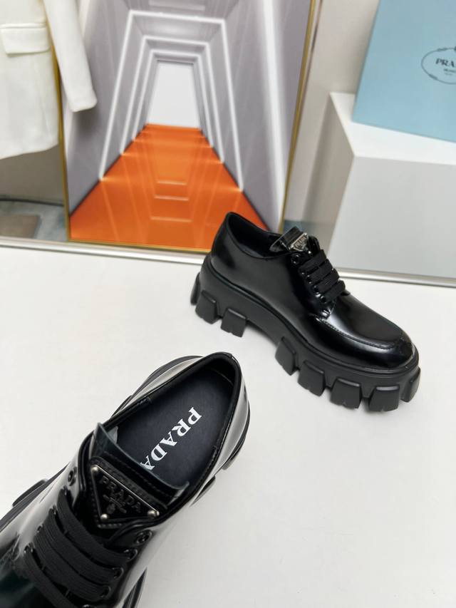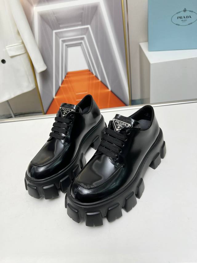 普拉达新款乐福鞋 面:进口开边珠 漆皮 里:混种羊皮 底:松糕组合厚底 跟高:4Cm Size:35-41