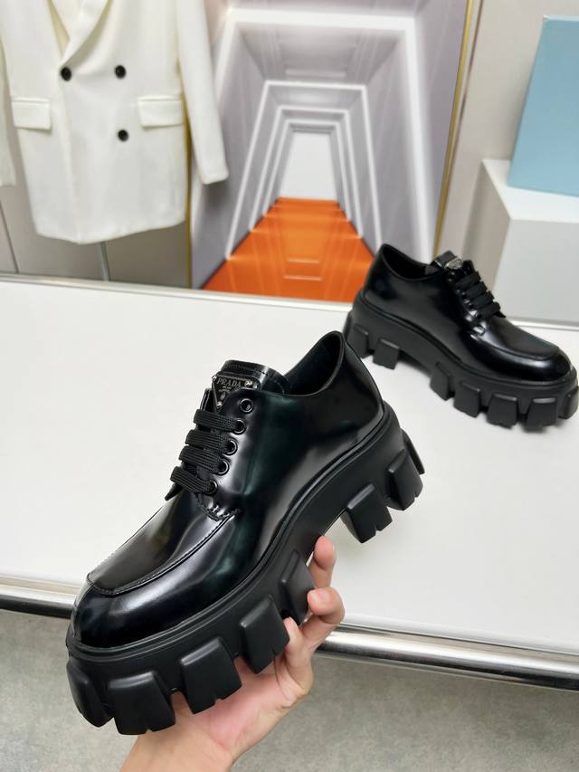 上新了 Prada普拉达 年早春夏升级版三角标厚底的设计上脚能增高不少哦! 原版购入拆卸复刻 还原正品味道 顶级代购版本! 鞋面原版开边珠牛皮 超有质感 内里 垫脚采用顶级混种羊皮 Zp开模成型大底 防滑耐磨 女款 35-41 出厂价P