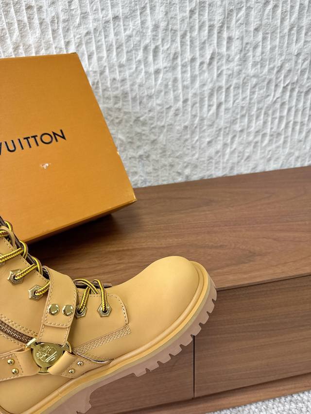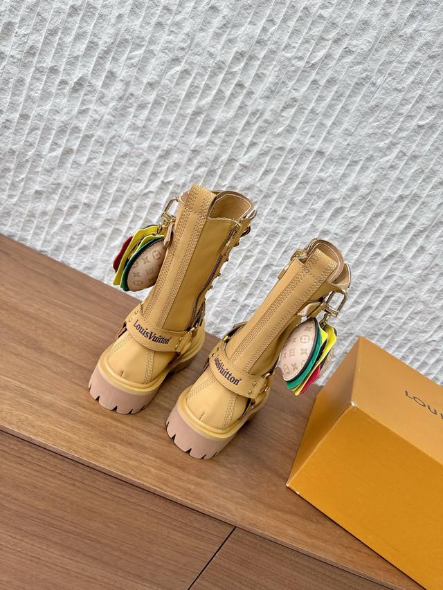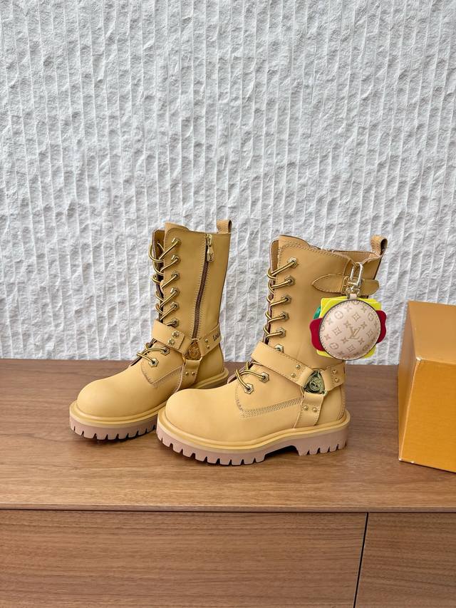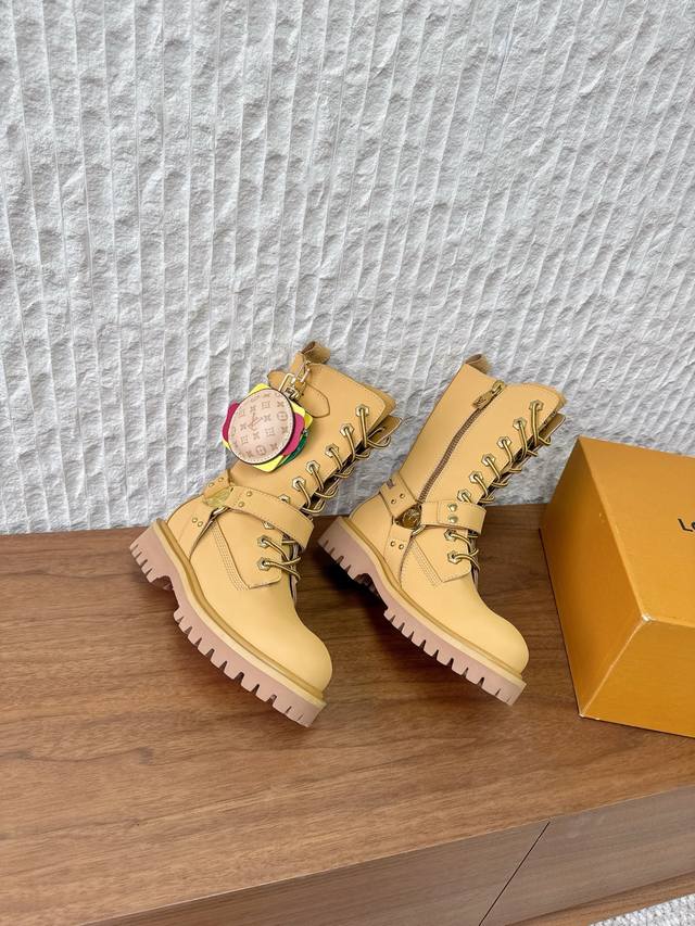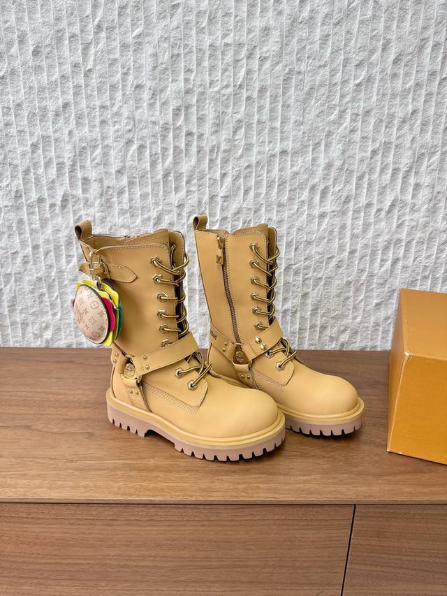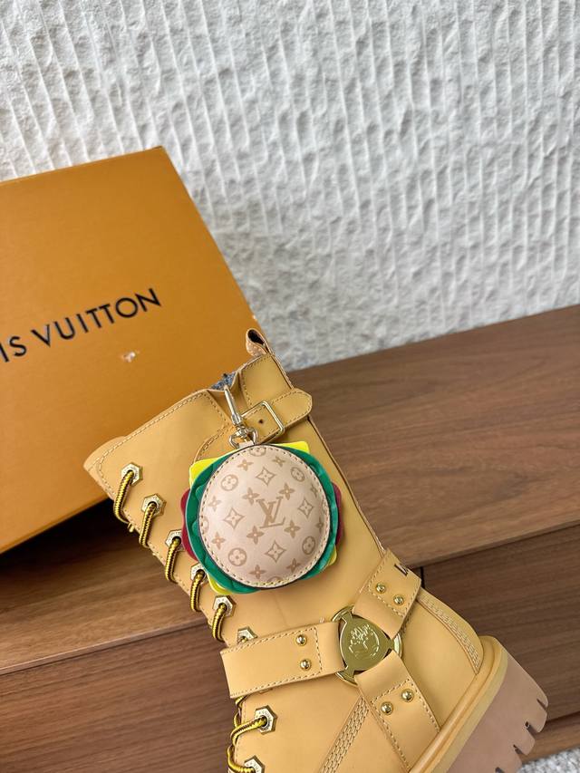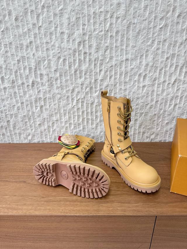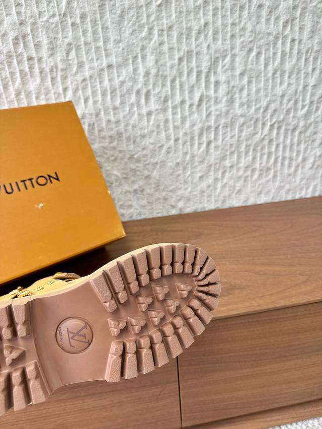 不要汉堡包-220 G566 Louis Vuitton X Timberland 联名款 路易威登 25Ss秋冬新款 系带 机车靴 这款松糕厚底系列今年非常爆,穿上**效果,和时尚的引领绝对的Yyds! 小牛皮Lv Remix Derby从经典登山靴中汲取灵感,重新构想其比例,打造出时尚前卫的轮廓。 鞋面结合了厚鞋带和刻有字母花的钩子,细节取自路易威登皮革制品,特别是字母帆布钥匙铃和黄色缝线的天然皮革后标签。这款鞋采用了厚实的橡胶外底。 鞋面:采用原版进口小牛皮 漆皮 内里垫脚:羊皮 跟高:4Cm 鞋底