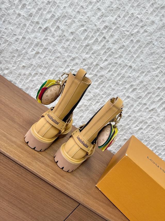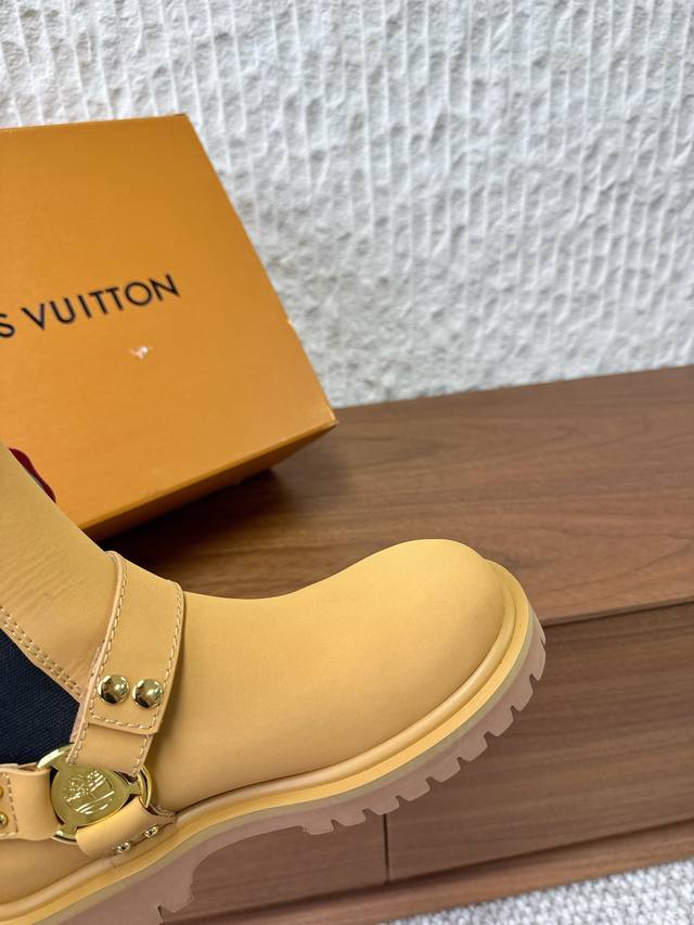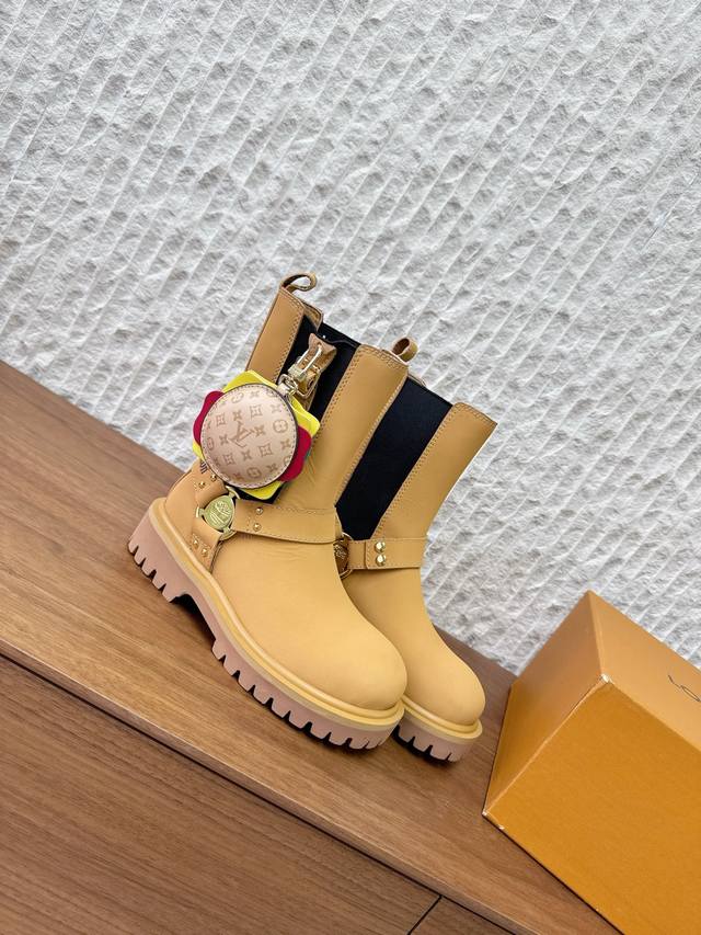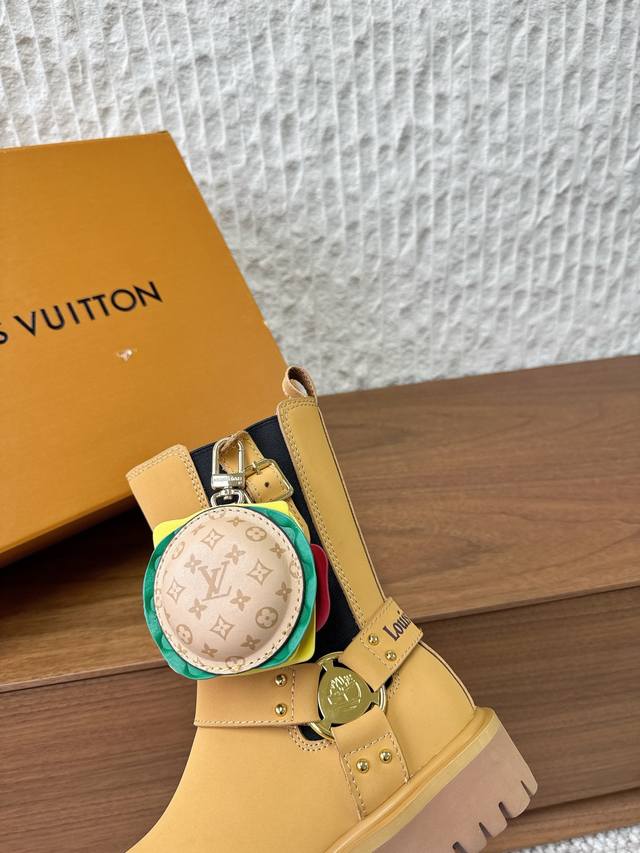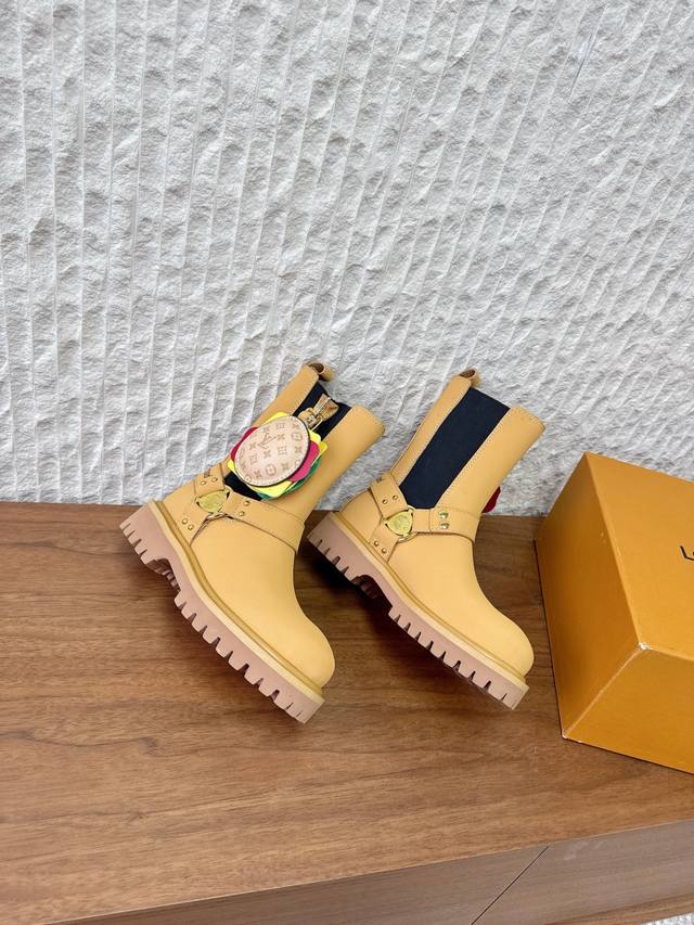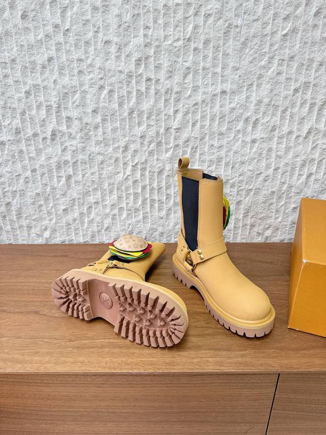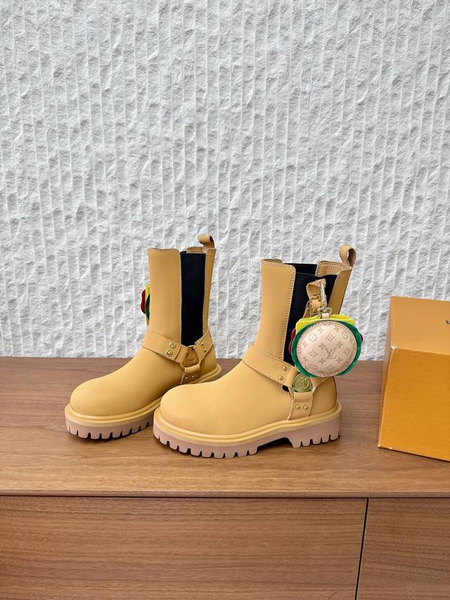 不要汉堡包-220 G566 Louis Vuitton X Timberland 联名款 路易威登 25Ss秋冬新款 系带 机车靴 这款松糕厚底系列今年非常爆,穿上**效果,和时尚的引领绝对的Yyds! 小牛皮Lv Remix Derby从经典登山靴中汲取灵感,重新构想其比例,打造出时尚前卫的轮廓。 鞋面结合了厚鞋带和刻有字母花的钩子,细节取自路易威登皮革制品,特别是字母帆布钥匙铃和黄色缝线的天然皮革后标签。这款鞋采用了厚实的橡胶外底。 鞋面:采用原版进口小牛皮 漆皮 内里垫脚:羊皮 跟高:4Cm 鞋底